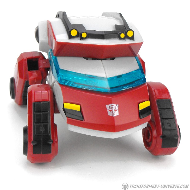 Alternate Mode: Let’s start with saying that I like Ratchet’s vehicle mode. It is a Cybertronian transport vehicle of sorts that more resembles a camper. Instead of traditional wheels or treads, he has limbs with individual treads. This gives him a taller looking image and a great deal of clearance... supposedly. The hip joint from the robot mode protrudes out, almost touching the surface the treads rest on. The shell sits high with a lighting system on the front, and the rear bumper is made of the shock pads. His hood and cockpit are actually small like a head, but since there aren’t supposed to be any pilots, it is not bothersome.