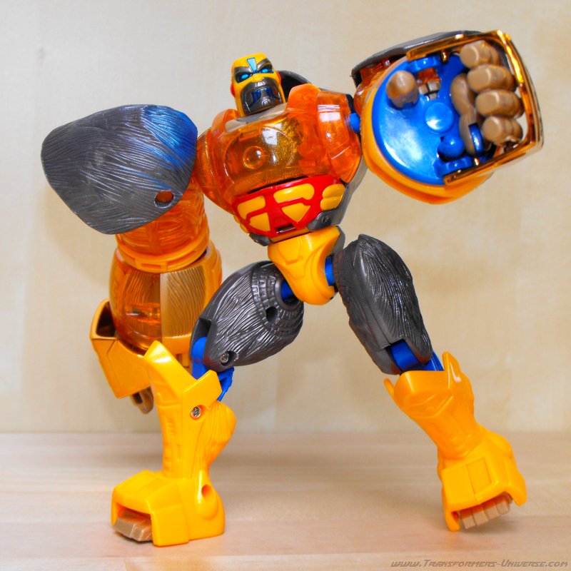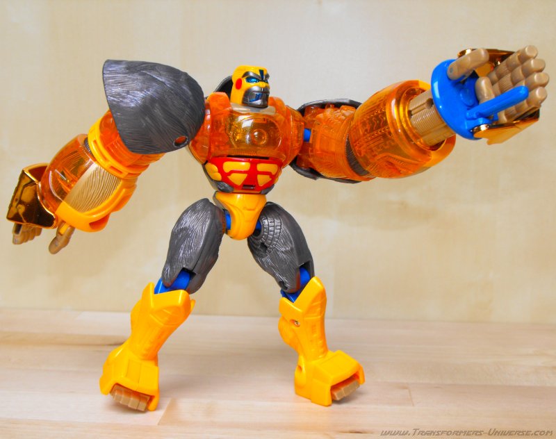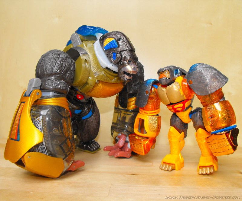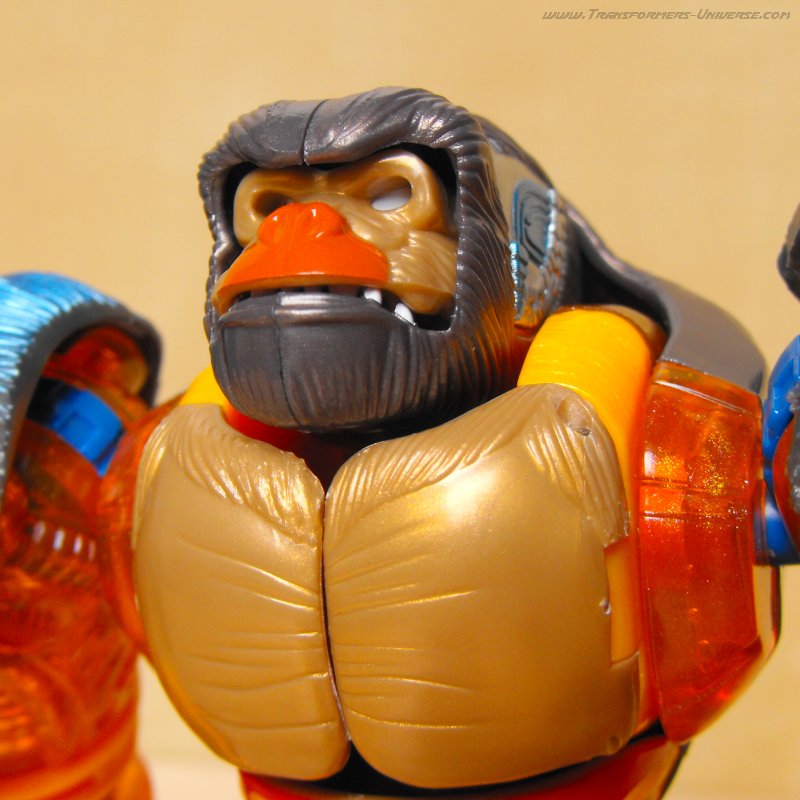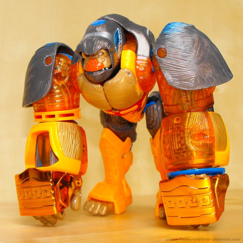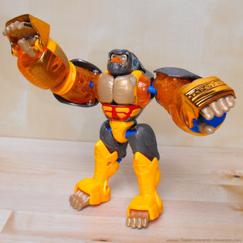Alternate Mode: Optimus Primal once again transforms into a gorilla, a techno-organic-looking one in this case. The differences to the robot mode are few and quickly told. A different head and chest plate, shortened legs and... different fingers. Yeah, different fingers. Primal's robot mode fingers slide in, which causes his beast mode fingers to slide out on the other side of the big brass knuckles he wears. Then you flip in the robot thumb and flip out the gorilla thumb. The difference between robot fingers and gorilla fingers being... finger nails. The gorilla has them, the robot doesn't. Oh, and the robot has these round thingies on his finger joints, too, which the gorilla doesn't. A lot of work for some very subtle differences. Make your own decision on whether or not that's a good thing.
