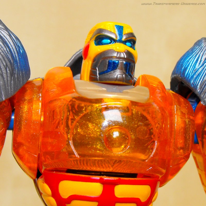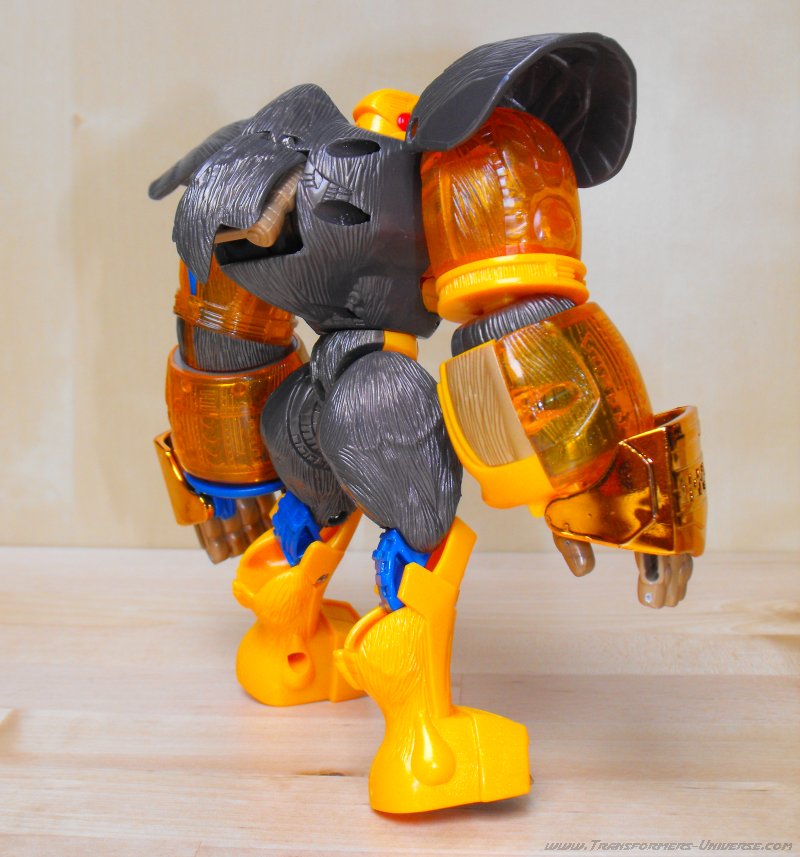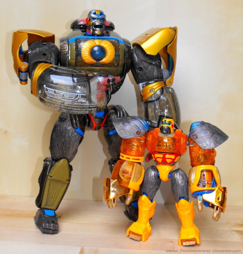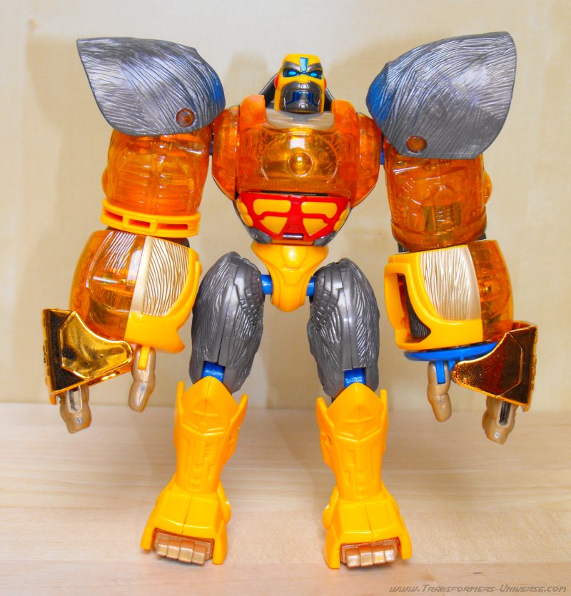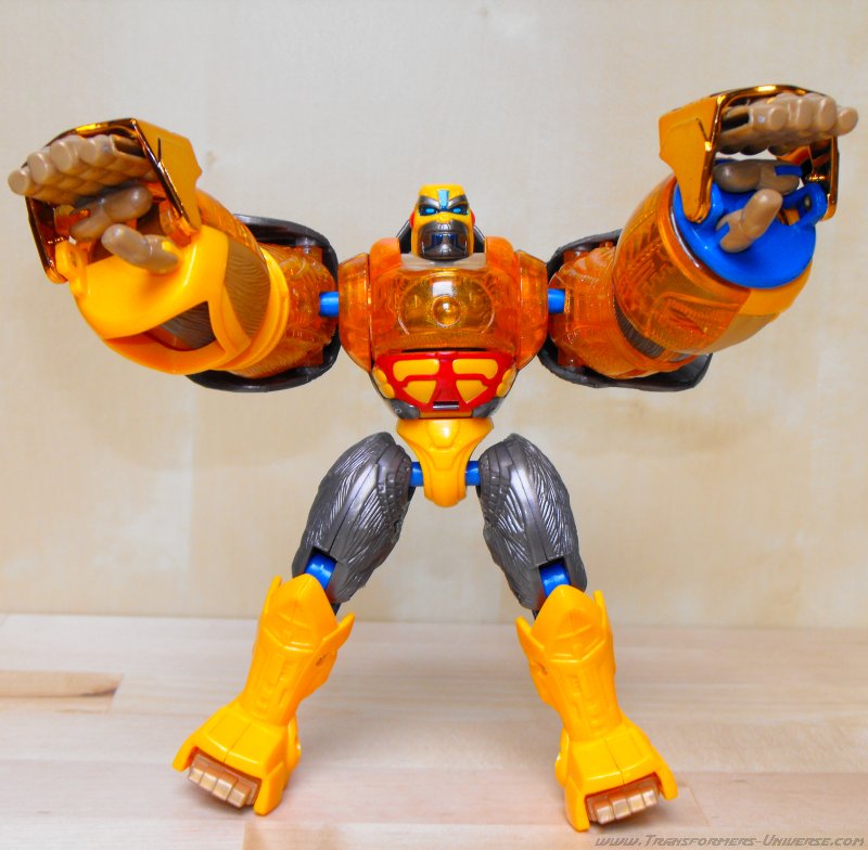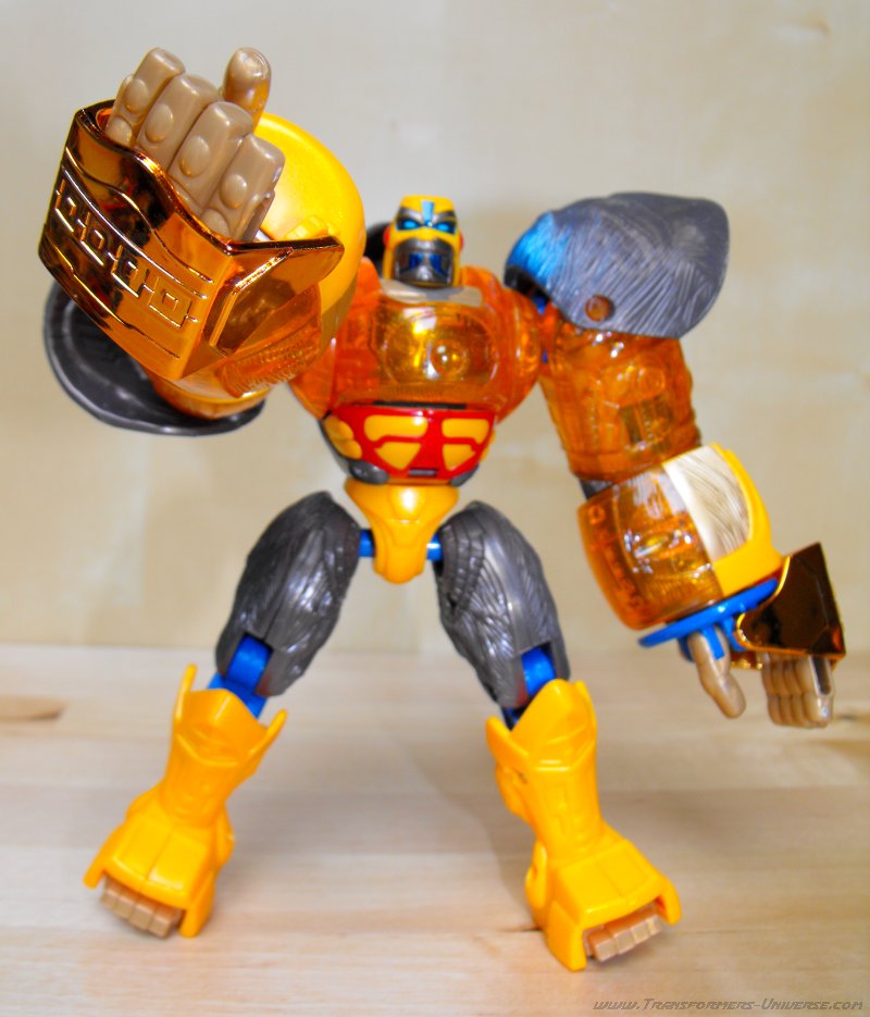 Alternate Mode: Optimus Primal once again transforms into a gorilla, a techno-organic-looking one in this case. The differences to the robot mode are few and quickly told. A different head and chest plate, shortened legs and... different fingers. Yeah, different fingers. Primal's robot mode fingers slide in, which causes his beast mode fingers to slide out on the other side of the big brass knuckles he wears. Then you flip in the robot thumb and flip out the gorilla thumb. The difference between robot fingers and gorilla fingers being... finger nails. The gorilla has them, the robot doesn't. Oh, and the robot has these round thingies on his finger joints, too, which the gorilla doesn't. A lot of work for some very subtle differences. Make your own decision on whether or not that's a good thing.