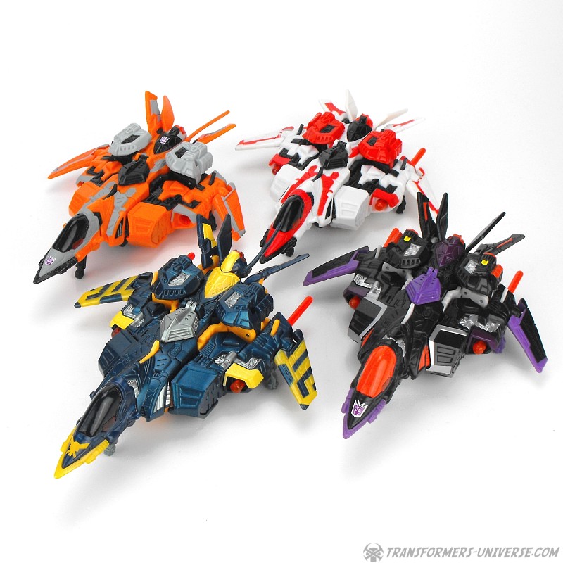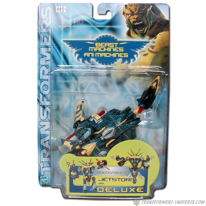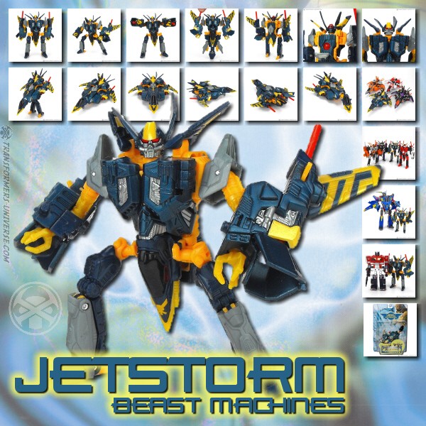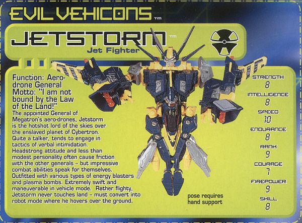The appointed General of Megatron's aero-drones, Jetstorm is the hotshot lord of the skies over the enslaved planet of Cybertron. Quite a talker, tends to engange in tactics of verbal intimidation. Headstrong attitude and less than modest personality often cause friction with the other generals - but impressive combat abilities speak for themselves. Outfitted with various types of energy blasters and plasma bombs. Extremely swift and maneuverable in vehicle mode. Rather flighty, Jetstorm never touches land. - must convert into robot mode where he hovers over the ground.