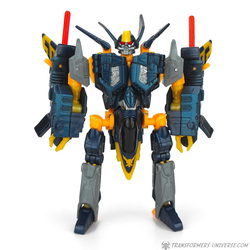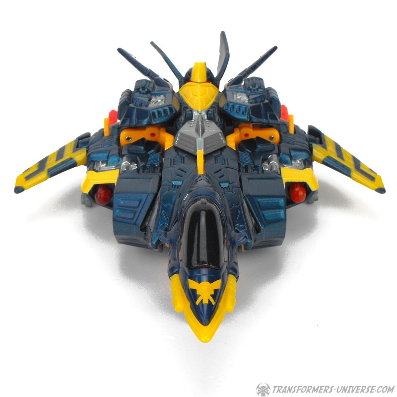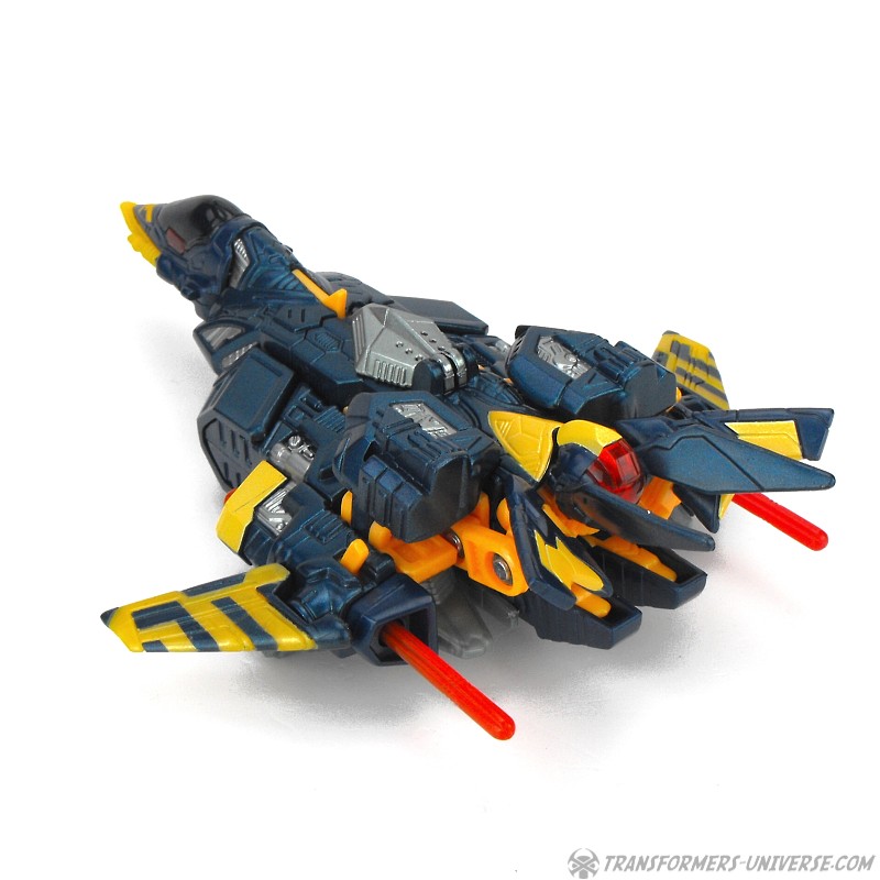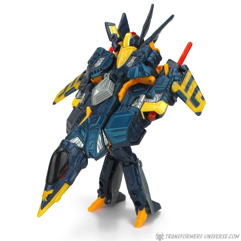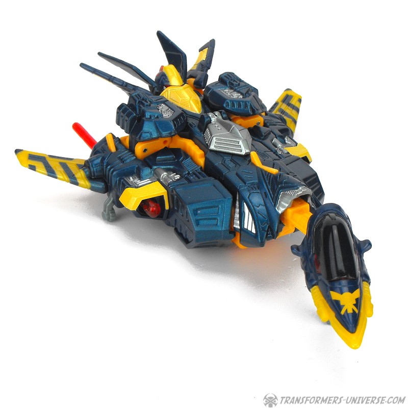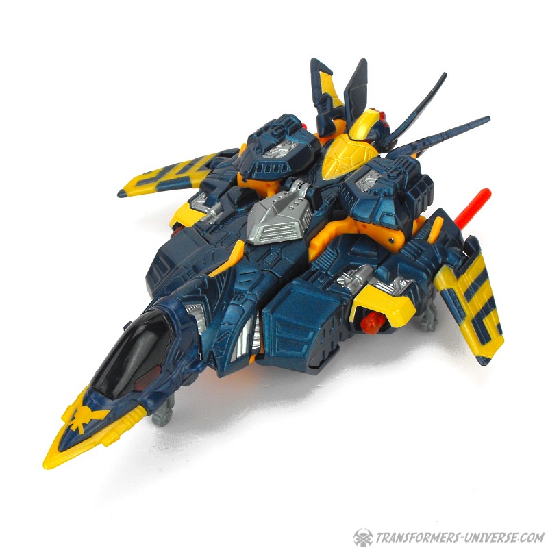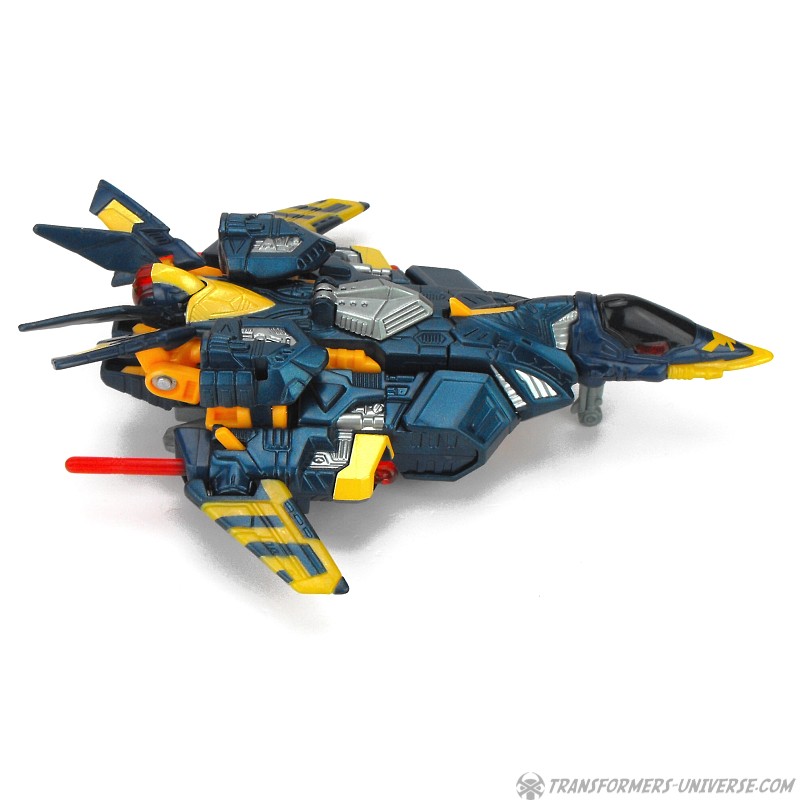 Alternate Mode: Jetstorm transforms into a jet (big stretch). The plane looks futuristic and streamlined, the wings maybe a little short to actually accomplish flight in any kind of real world. Who cares, though? Jetstorm can extend and bend his 'neck' in this mode, giving the jet mode a more alive-feel to it, and has a full landing gear. All in all a good jet mode.