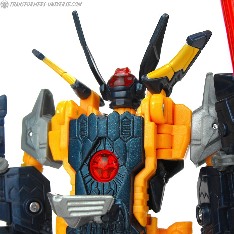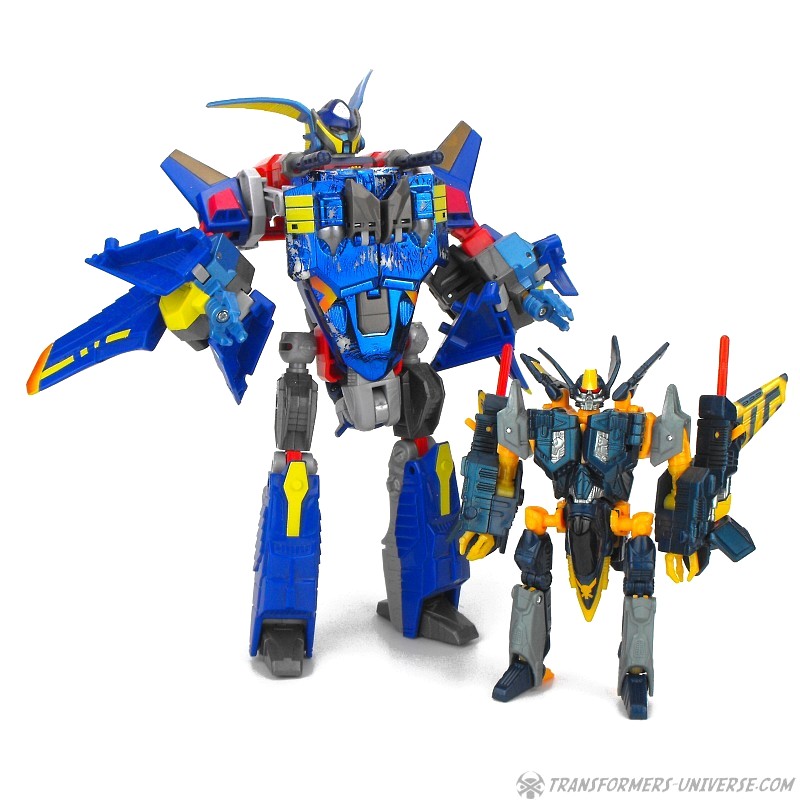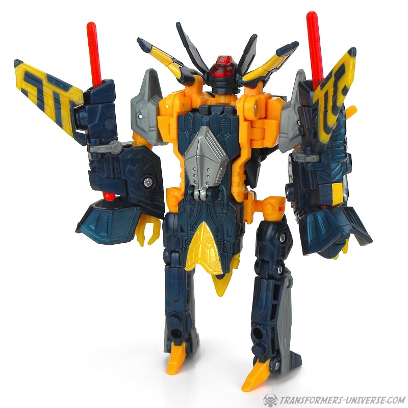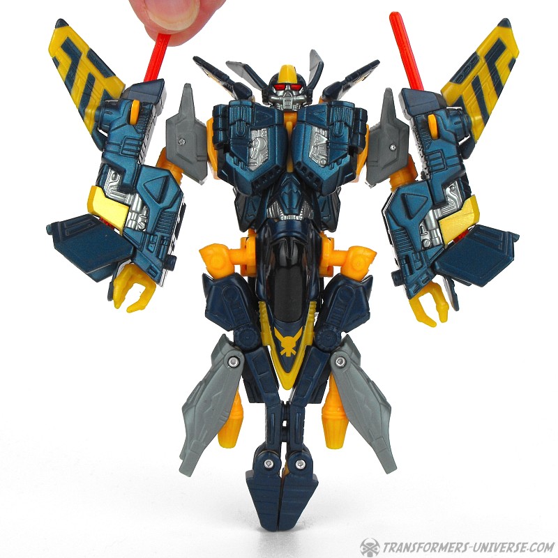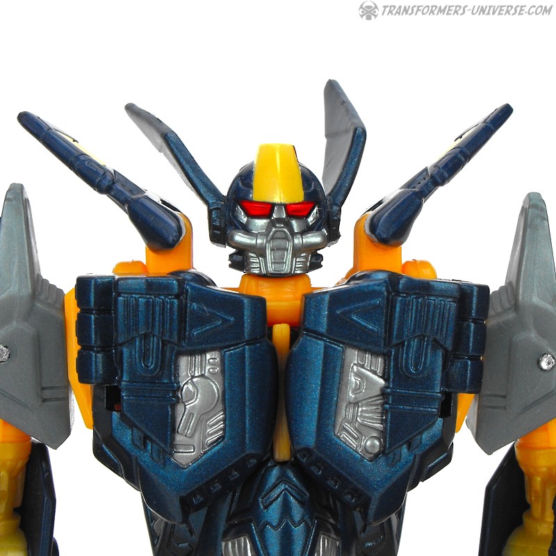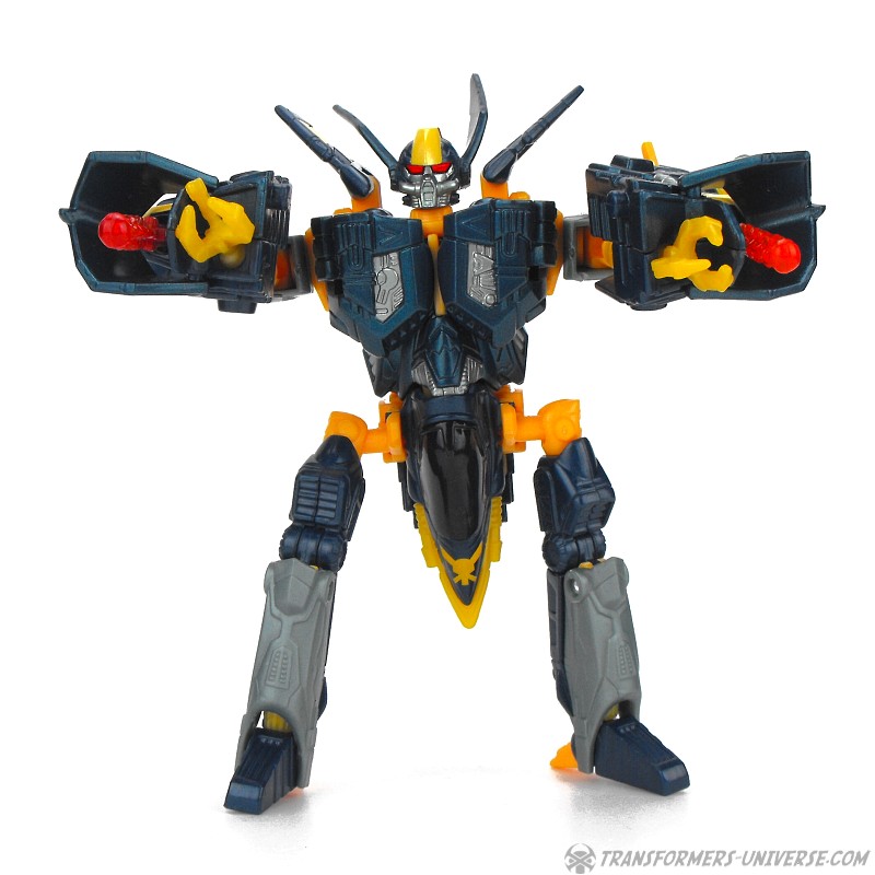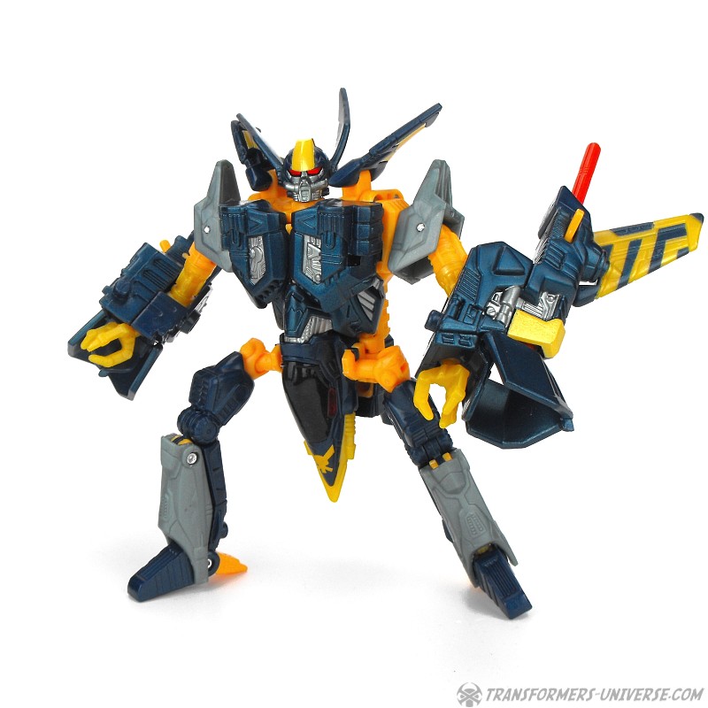 Alternate Mode: Jetstorm transforms into a jet (big stretch). The plane looks futuristic and streamlined, the wings maybe a little short to actually accomplish flight in any kind of real world. Who cares, though? Jetstorm can extend and bend his 'neck' in this mode, giving the jet mode a more alive-feel to it, and has a full landing gear. All in all a good jet mode.