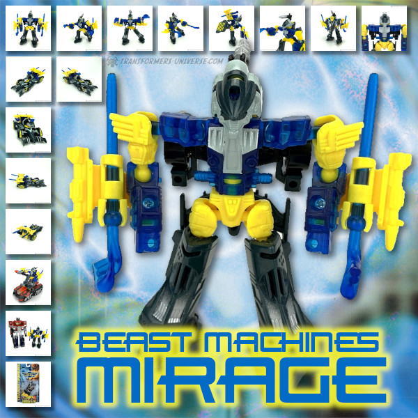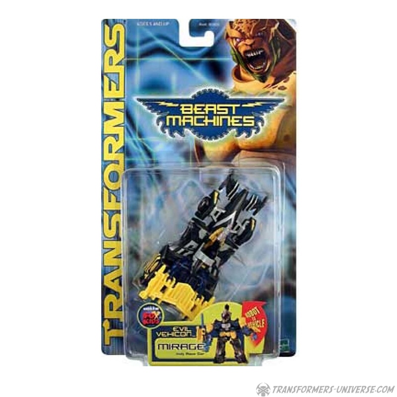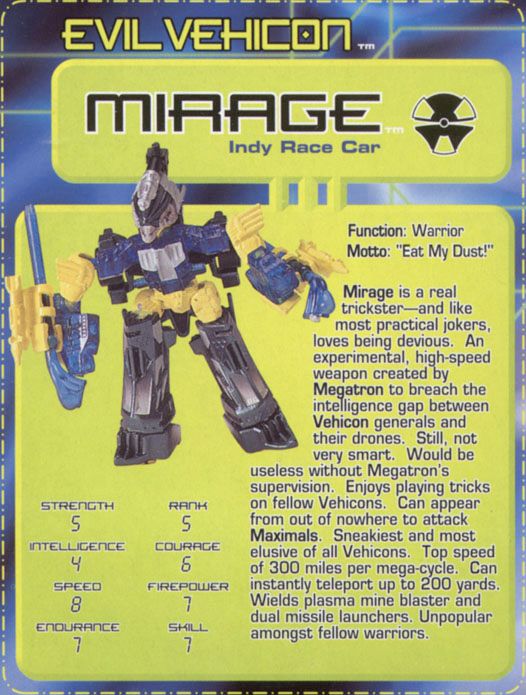 Mirage is a real trickster - and like most practical jokers, loves being devious. An experimental, high-speed weapon created by Megatron to breach the intelligence gap between Vehicon generals and their drones. Still, not very smart. Would be useless without Megatron's supervision. Enjoys playing tricks on fellow Vehicons. Can appear out of nowhere to attack Maximals. Sneakiest and most elusive of all Vehicons. Top speed of 300 miles per mega-cycle. Can instantly teleport up to 200 yards. Wields plasma mine blaster and dual missile launchers. Unpopular amongst fellow warriors.