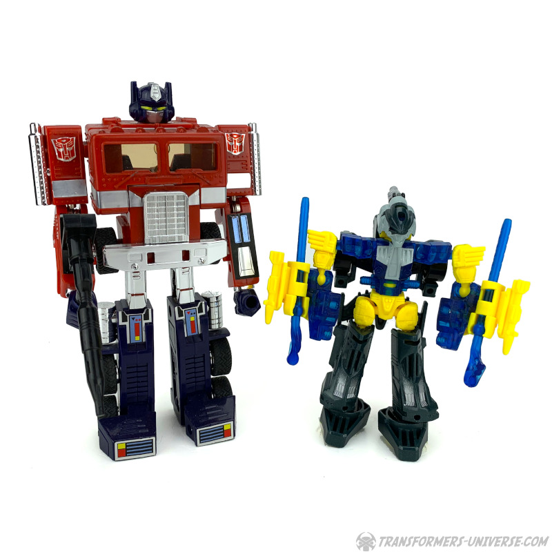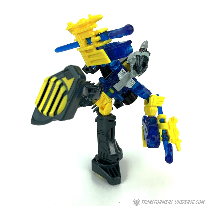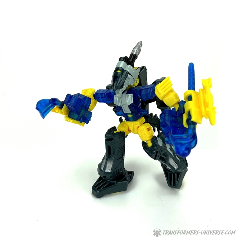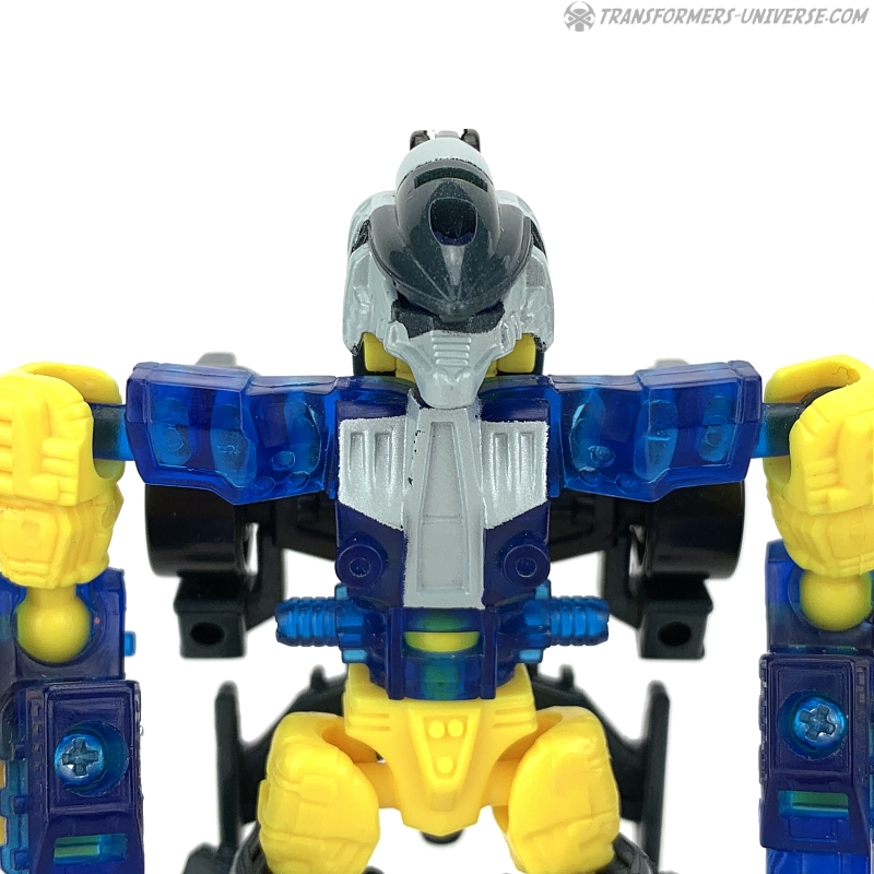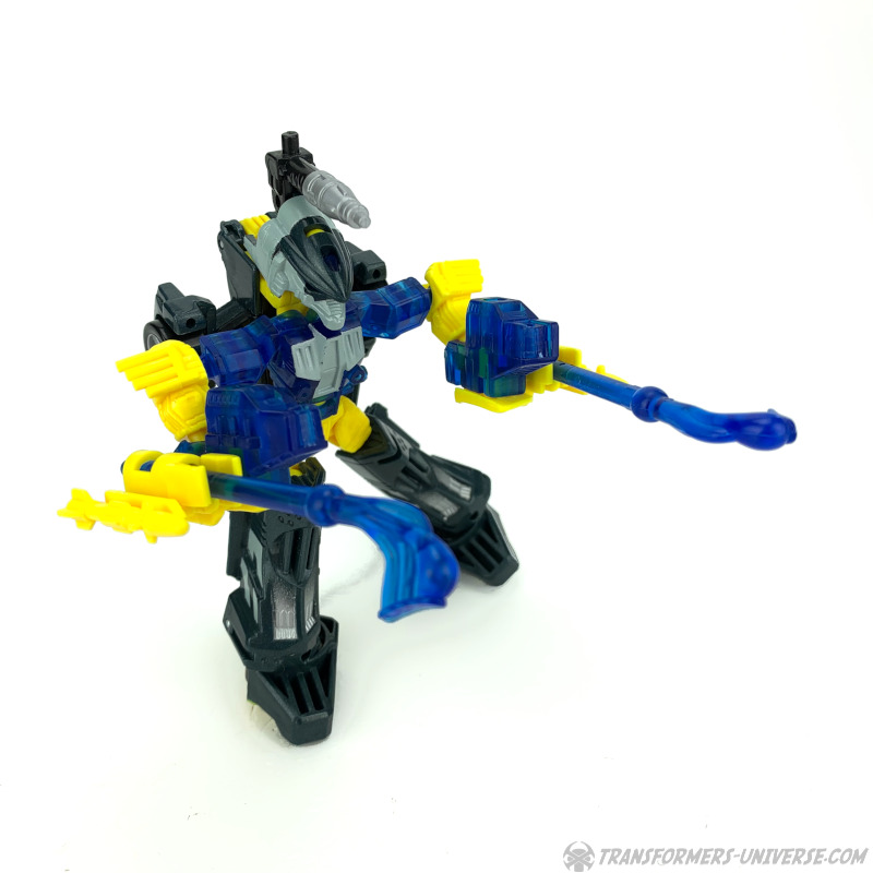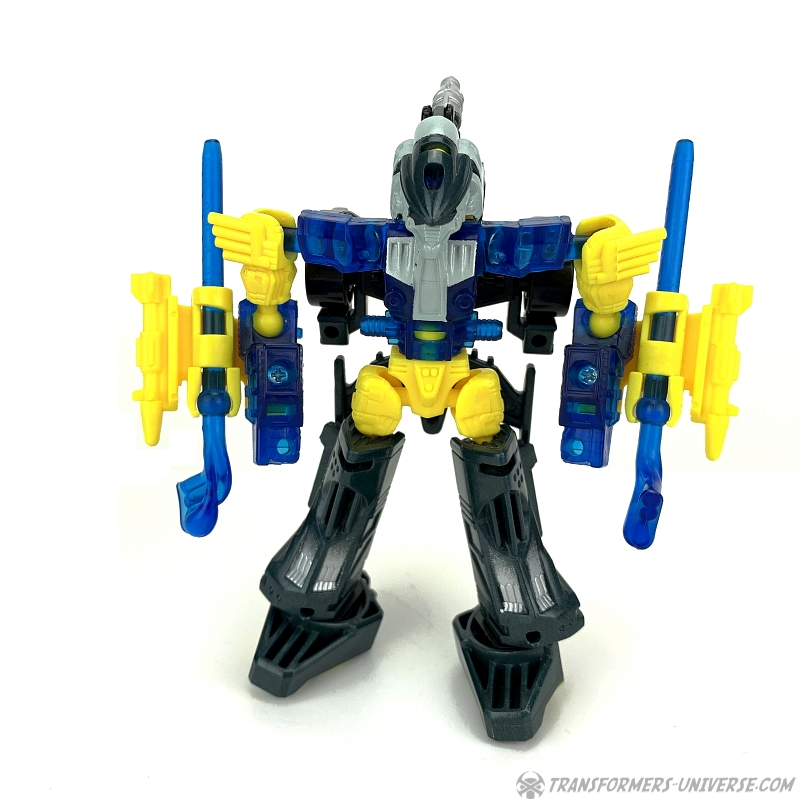 Robot Mode: A rather inhuman-looking robot, Mirage's robot mode is clearly secondary to his vehicle mode. The legs are pretty short and stubby, the head very long, and the colours rather dark except for the spotches of yellow. The posability is decent, but his feet (really the wheels of his car mode) are not the most solid of basis. He carries his blue missiles on his forearm and the blaster on his head can detach. Overall an average robot mode with a side order of slight bore.