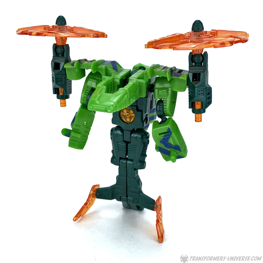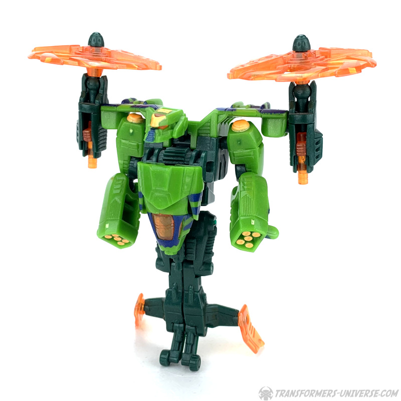 Now for the rest. Like most Vehicon drones and generals in Beast Machines (and some Maximals, too) Obsidian didn't have proper legs in the cartoon, instead he got around exclusively by hovering and flying. The toy accomplishes this by leaving his rotors on his shoulders while his lower body is pretty much the vehicle mode's rear assembly. Unlike other Vehicons he can stand in this mode without any problems, thanks to the fins. But if you want legs, you can do that, too, and simply split the rear assembly apart and voila, two legs. Bending knees and everything. Obsidian is actually one of the best BM-toys when it comes to solving the whole legs/no-legs thing.