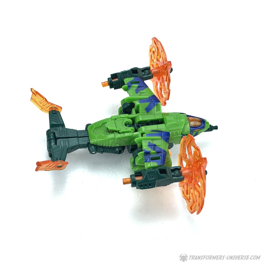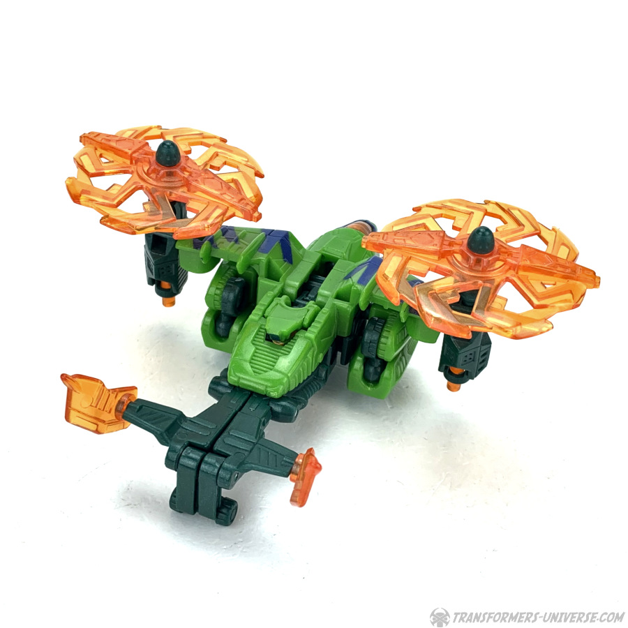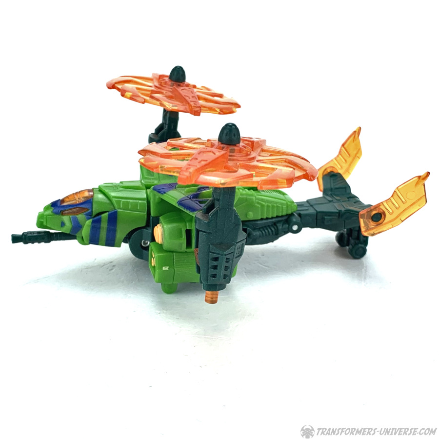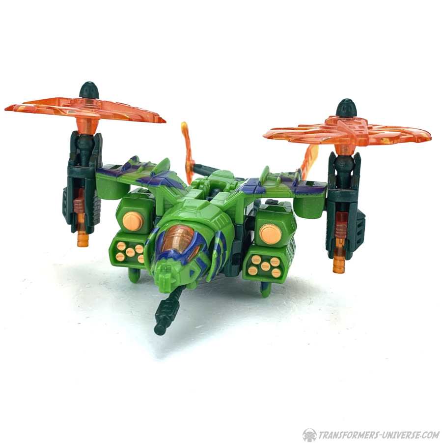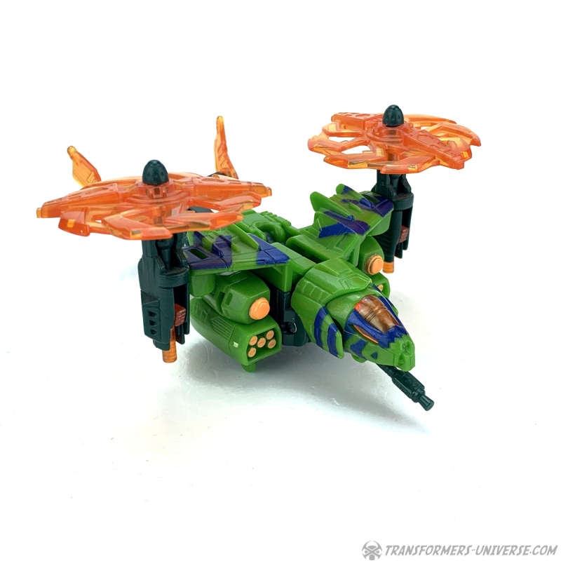 Alternate Mode: Obsidian transforms into what is basically the Cybertronian version of a V-22 Osprey, a hybrid between a helicopter and a jet. Movie fans might recognize it from Incinerator. This vehicle here's a very compact, heavily armed flying machine. It has missile launchers under its wings, a minigun under the cockpit, and the rotors themselves can flip forward and even be launched as missiles.