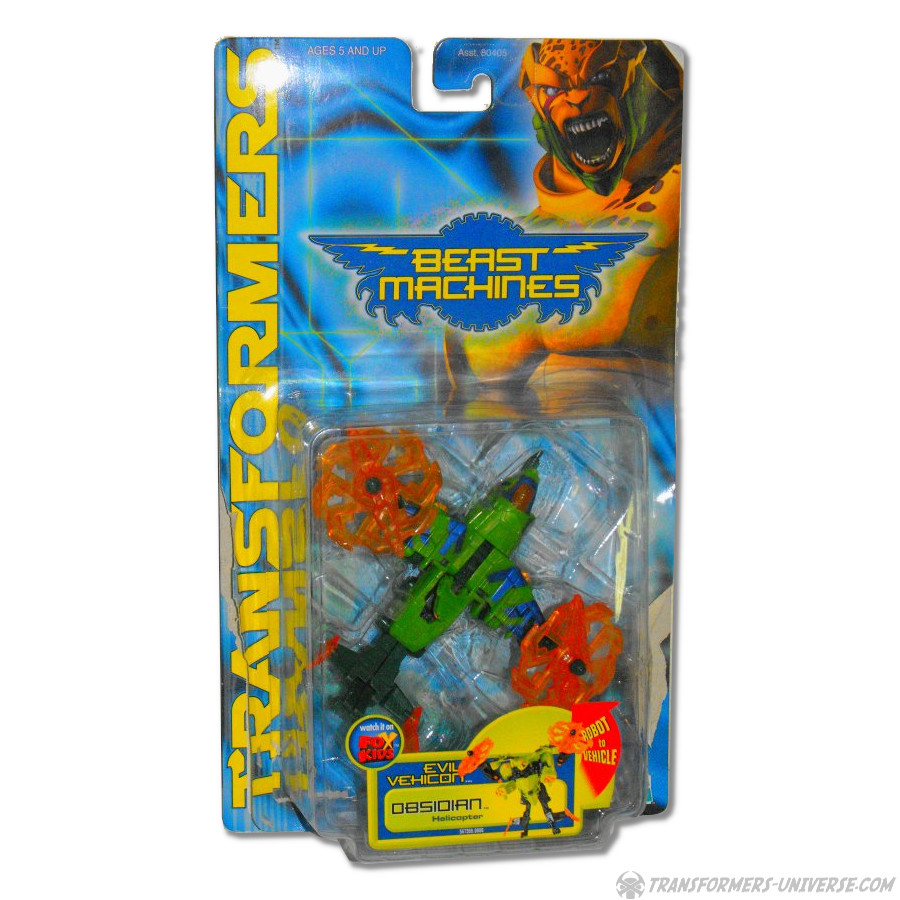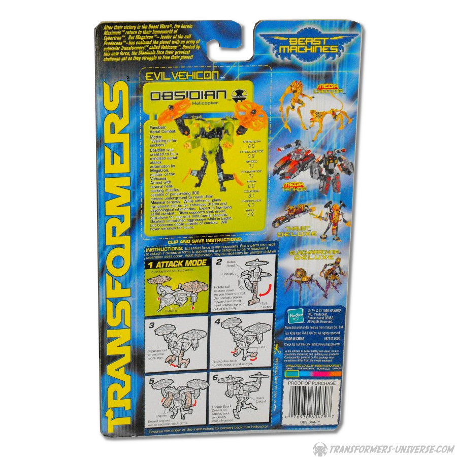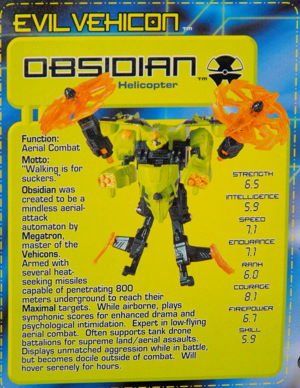 Obsidian was created to be a mindless aerial-attack automaton by Megatron, master of the Vehicons. Armed with several heat-seeking missiles capable of penetrating 800 meters underground to reach their Maximal targets. While airborne, plays symphonic scores for enhanced drama and psychological intimidation. Often supports tank drone battalions for supreme land/aerial assaults. Displays unmatched aggression while in battle, but becomes docile outside of combat. Will hover serenely for hours.