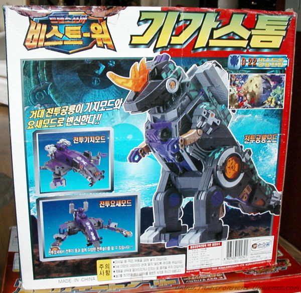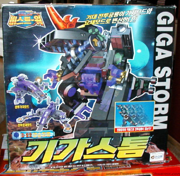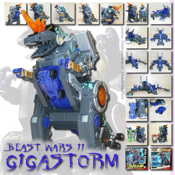 Gigastorm appeared in the Japanese-exclusive Beast Wars II series. He was originally known as Megastorm (a re-issue of G2 Megatron), but direct contact with the powerful Angolmois energy (the life force of Unicron) changed him into this more powerful configuration. As a figure I wouldn't call him an improvement over Trypticon, just different. While his alternate modes suffer a bit from the lack of extra parts and sticker details, his dino mode looks pretty impressive. Of course there is really no need to get both versions of this mold (unless you're a crazed collector like me) and if you ask me which one is better, I'd still say Trypticon (by a hair), but still, Gigastorm is a pretty cool figure. So if you can get him for a decent price, do it.