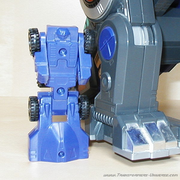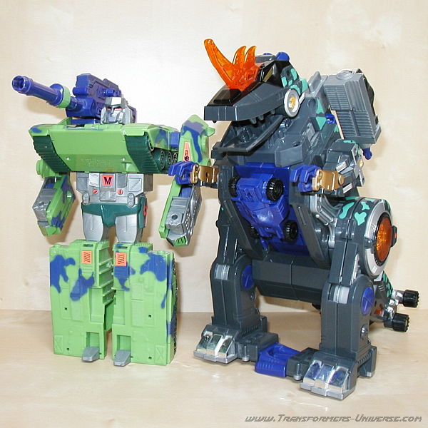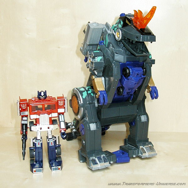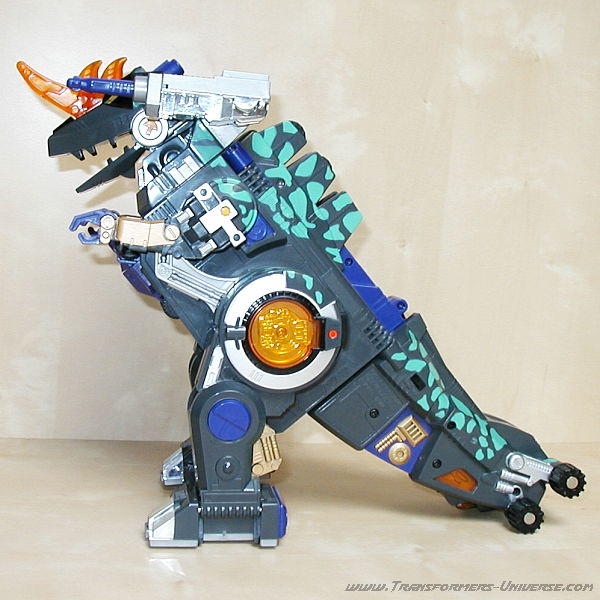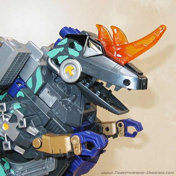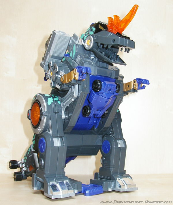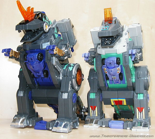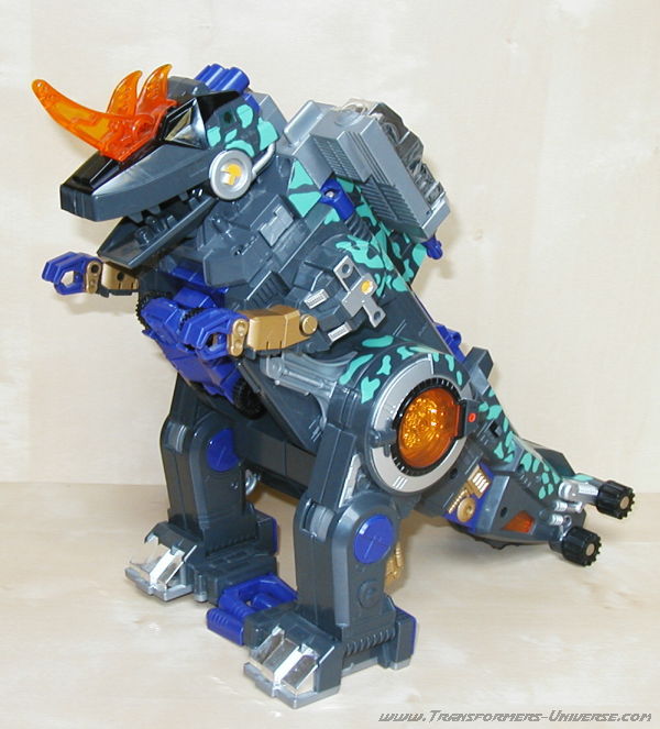 Where Gigastorm really shines is the robot mode (or dino mode, rather). A scale-like pattern has been added to his back, giving him an almost Godzilla-like look. A new, much bigger horn has been put on his head, so in a head-on collision he'd take Trypticon down without problem. Like Trypticon, Gigastorm is able to walk by itself by throwing a switch on his tail. A direct comparison also shows that Gigastorm is slightly faster than Trypticon (but both still needed several minutes to cover a distance of about two meters).