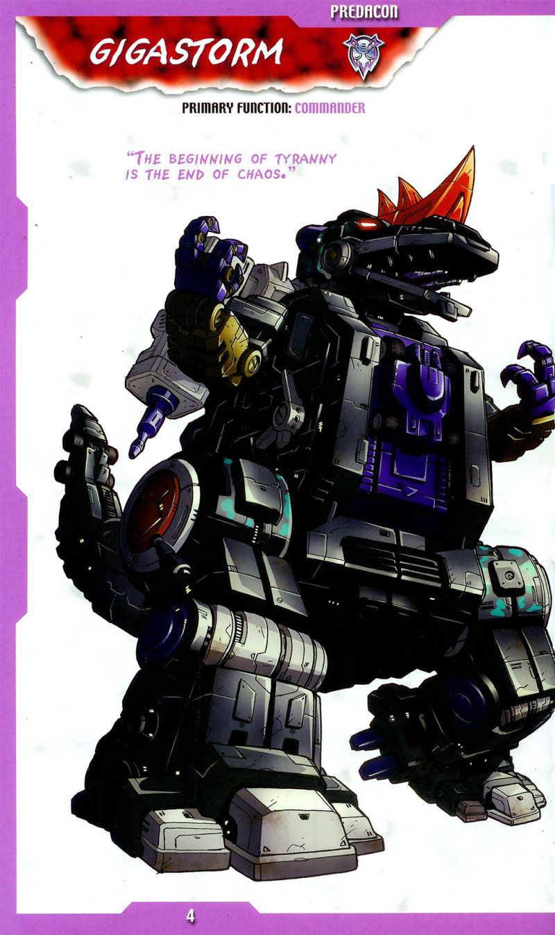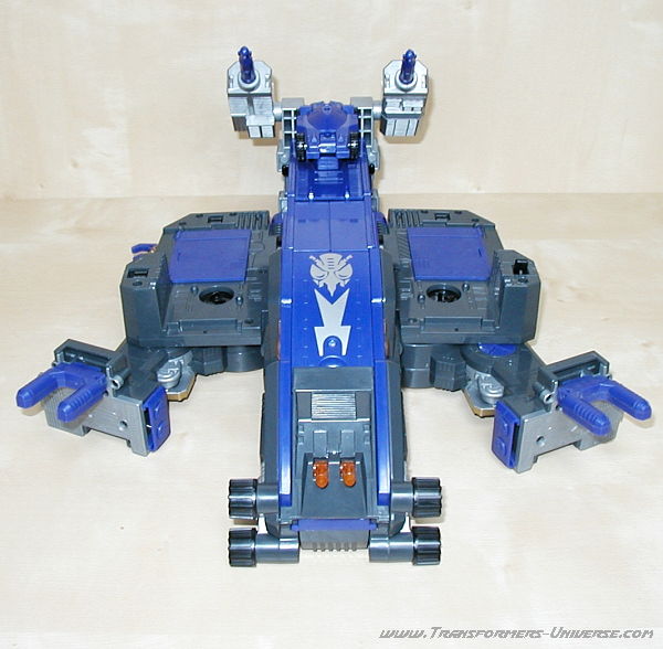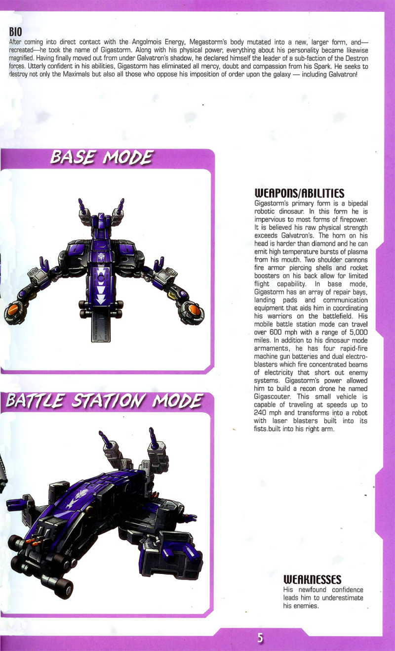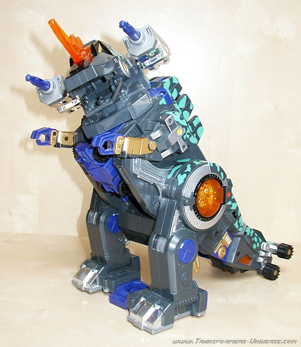 This is Megastorm's new form, powered up under the influence of the evil Angolmois energy. He transforms in three stages, from destroying dinosaur to monolithic base to attack fortress. His audacious offensives, making use of his tremendous power, force the Cybertrons into tight spots again and again. He is on the verge of no longer considering Galvatron his older brother, and the danger of a split in the camp now looms large. The Gigahorn on his head is harder than diamond, and can pierce through all manner of things.