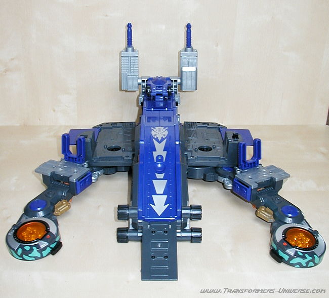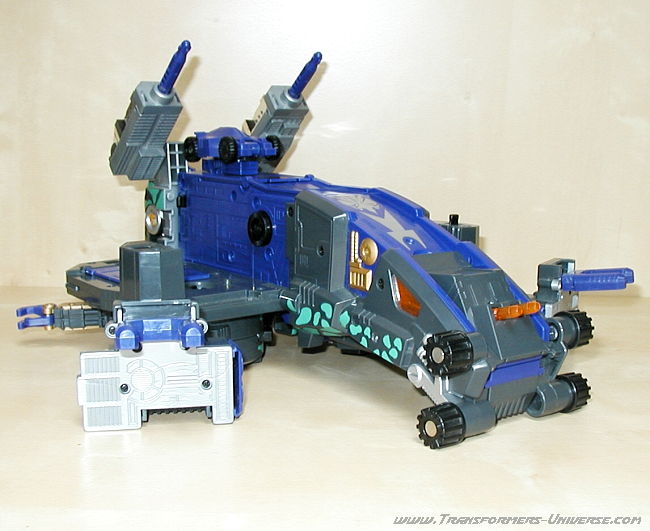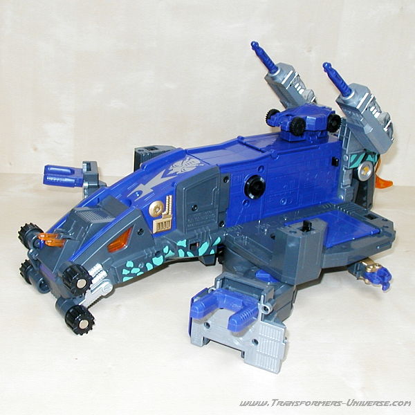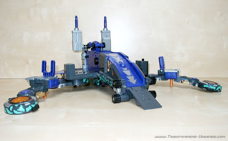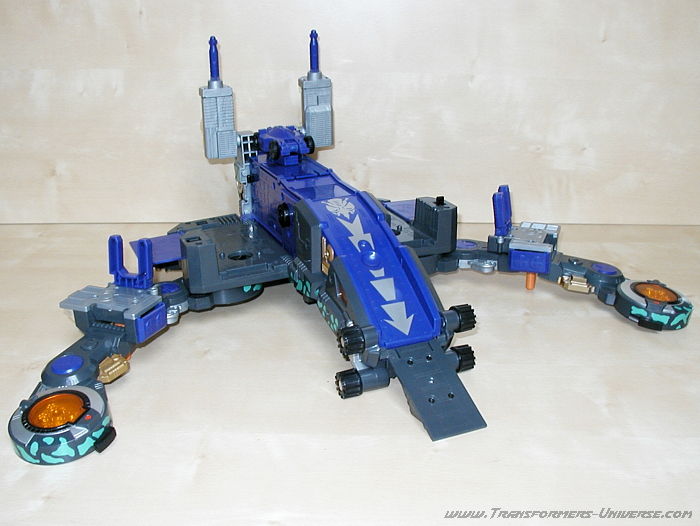 Remarks: Gigastorm is a repaint of the G1 city robot Trypticon, so look there for the full review. Just some words on the changes made for Beast Wars II. Like with other G1 robots re-issued for new series (see Brave Maximus for example), the Japanese have left out several of the original's extras and add-on pieces, such as Trypticon's Brunt tank. This causes Gigastorm's city mode to look a little naked when compared to Trypticon's, but it doesn't drag him down that much. Still, Trypticon looks better in city or battlestation mode than Gigastorm does.