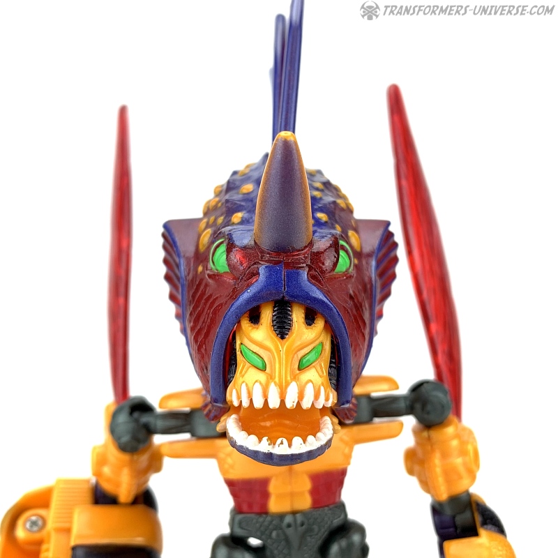 Apart from his “ceremonial rapid-fire poison arrow launcher“ (a missile launcher from a time when those actually launched a missile), Rartorata also contains a second weapon gimmick. Pressing a plate on the back of his head tips it forward and those fins on top of his head fold out to skewer some poor, unfortunate Maximal.