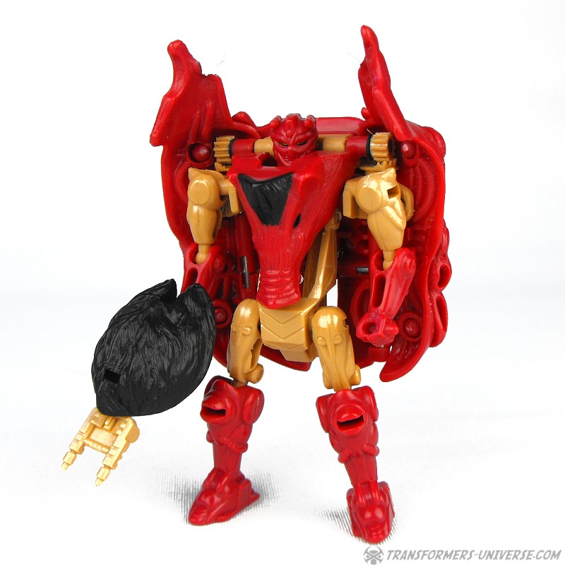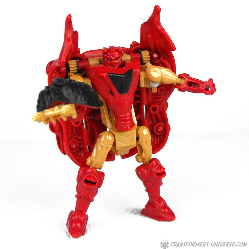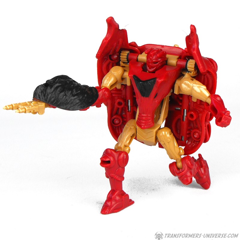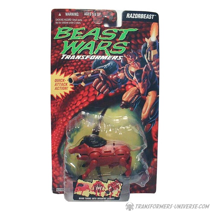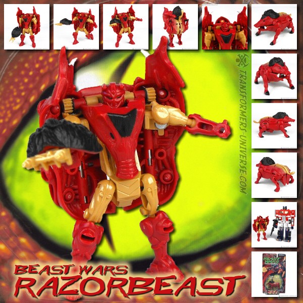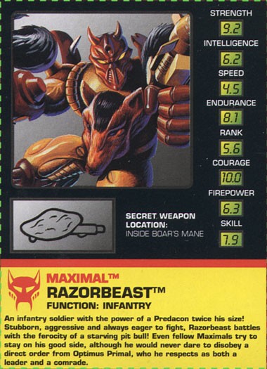 An infrantry soldier with the power of a Predacon twice his size! Stubborn, aggressive and always eager to fight, Razorbeast battles with the ferocity of a starving pit bull! Even fellow Maximals try to stay on his good side, although he would never dare to disobey a direct order from Optimus Primal, who he respects as both a leader and a comrade.