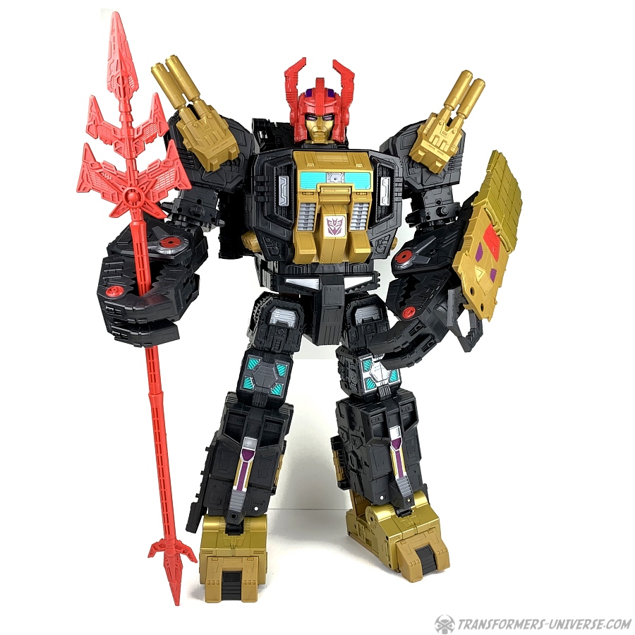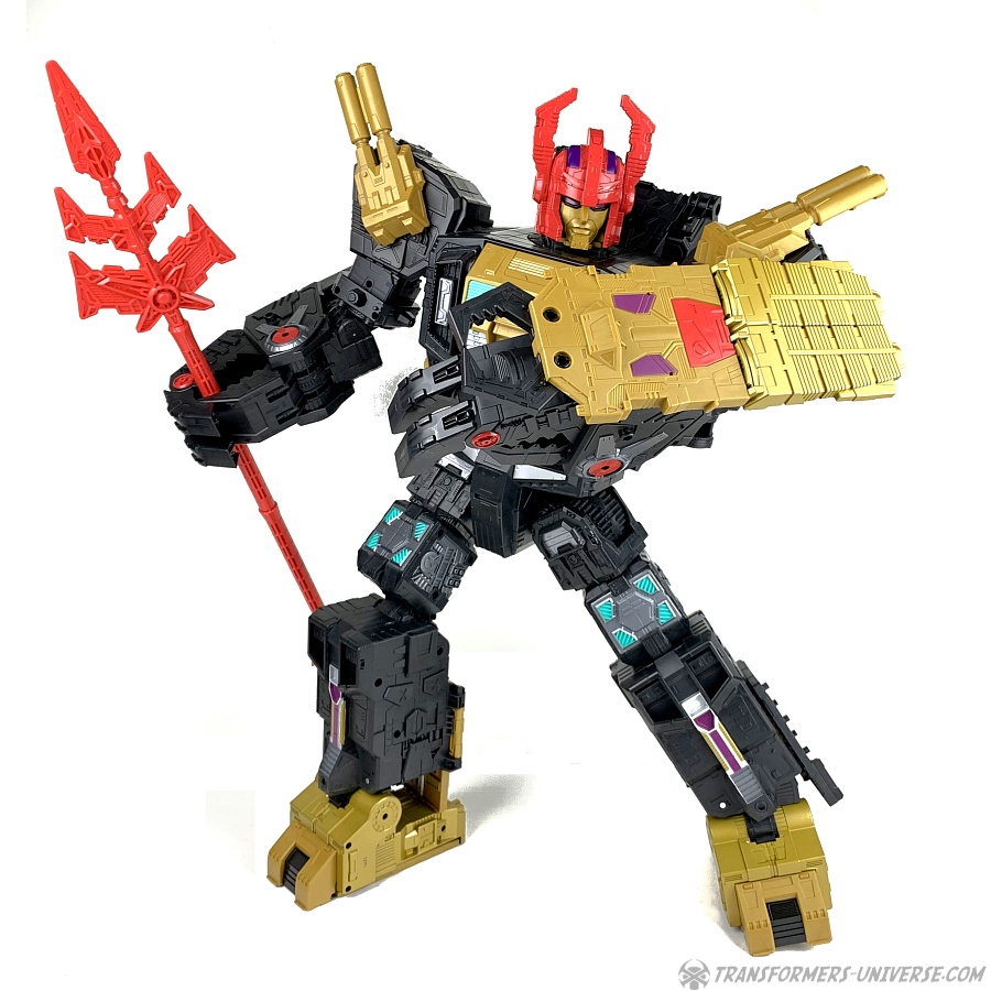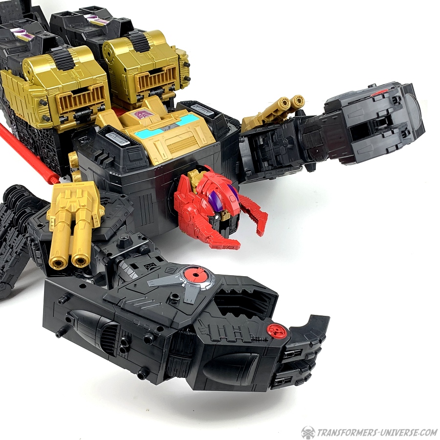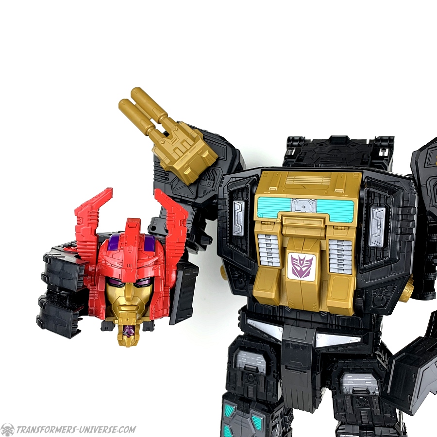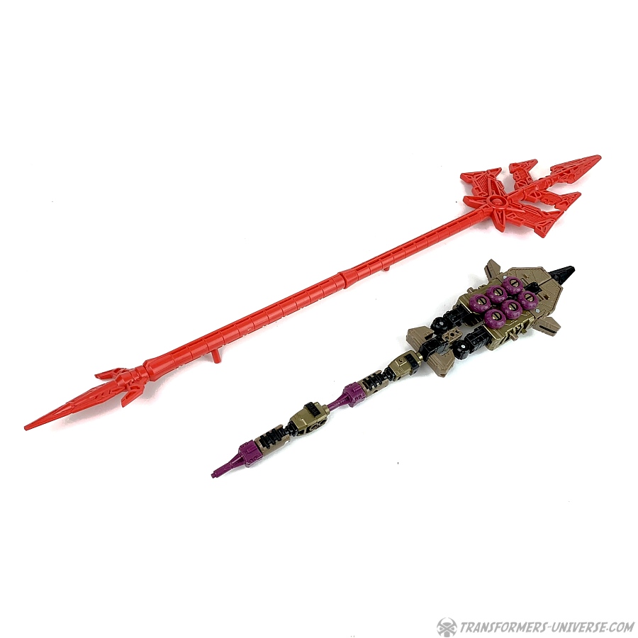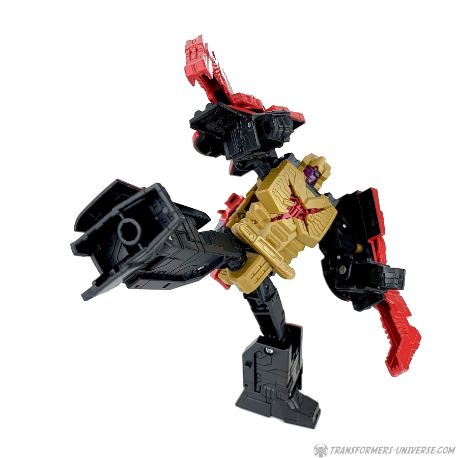 Black Zarak is very nicely articulated, and his big feet give him a stable platform. Despite his size, he can easily perform a kick without toppling over. His huge claws are articulate and can easily hold his primary weapon, the Tyrant spear, and even his own head (more on that below). Additional weapons are the double-barreled guns on his shoulders. Slight point deduction: he only comes with two of those guns instead of four like his G1 counterpart. There are upgrade sets for that, sure, but why not include four guns to start with?
