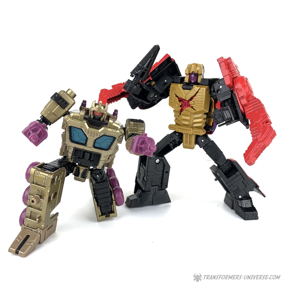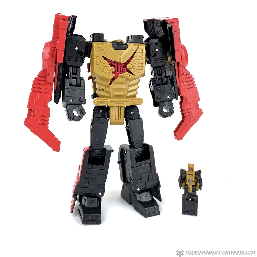 Anyway, Black Zarak also comes with a shield that he can put on his arm or carry on his back. The shield can be made bigger by attaching the two golden pieces from his legs. Now the original Black Zarak came with a support robot called Black Roritchi and that figure was also available separately as a Generations Selects Weaponizer. Black Zarak can wield Black Roritchi in his spear mode, though that spear is a good deal smaller than the Tyrant spear. Well, it’s the thought that counts.