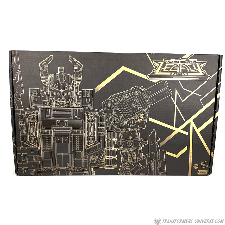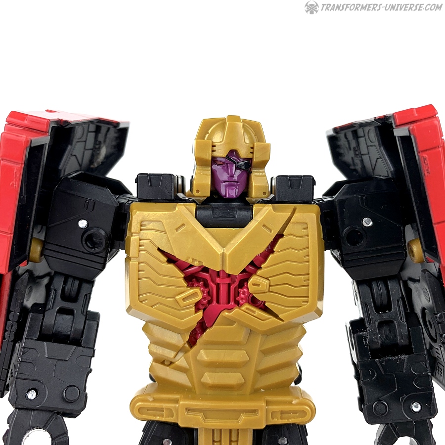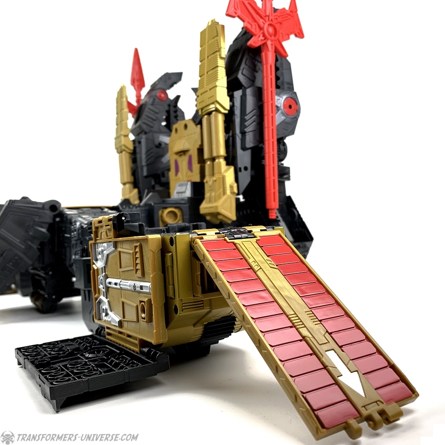 Robot Mode: Let’s start by saying that Black Zarak is big. Granted, he is a Titan, so that is kind of to be expected, but still: he’s big. Not quite as big as Fortress Maximus, but still: big. Much like his predecessor Masterforce Black Zarak, he is mostly black with red and golden highlights. The head is a dead ringer for the one he sported in the Masterforce cartoon and looks great. His silhouette is pretty clean, the only kibble is the city-mode ramp on his back.