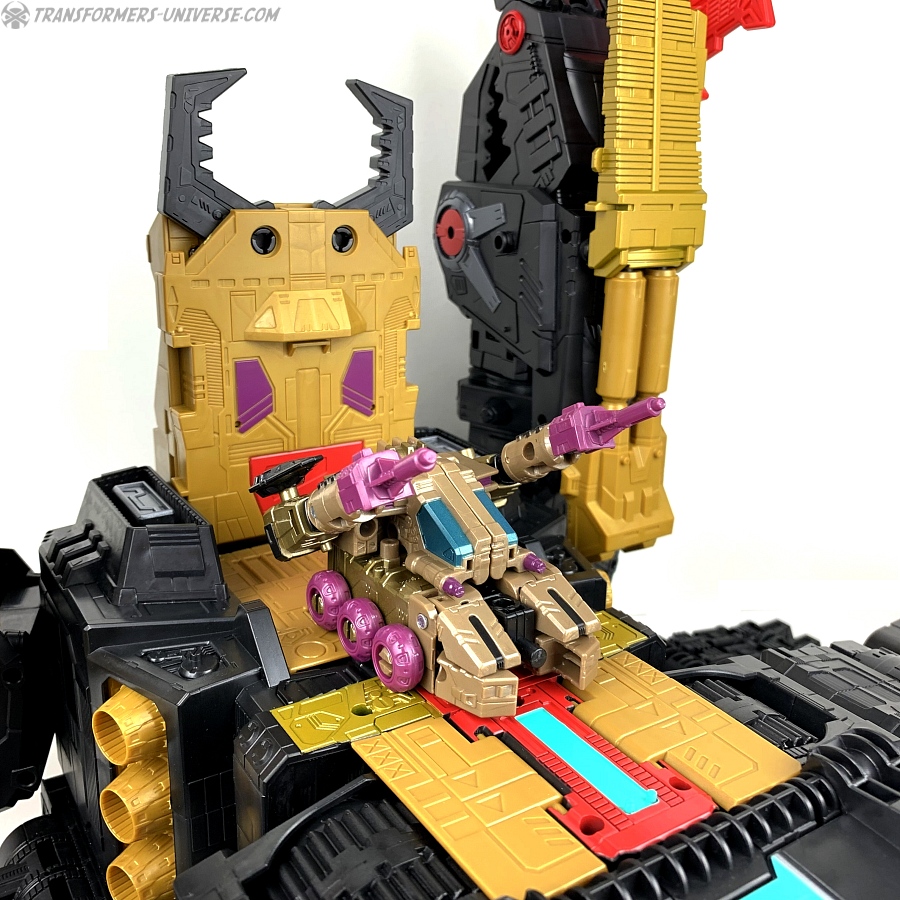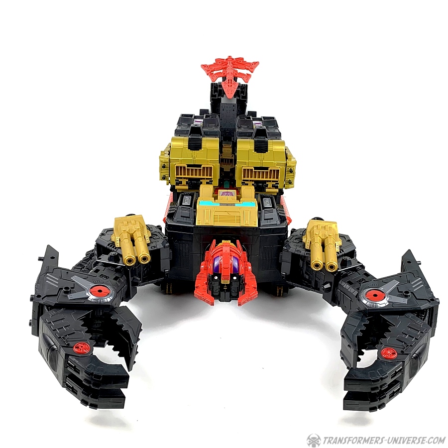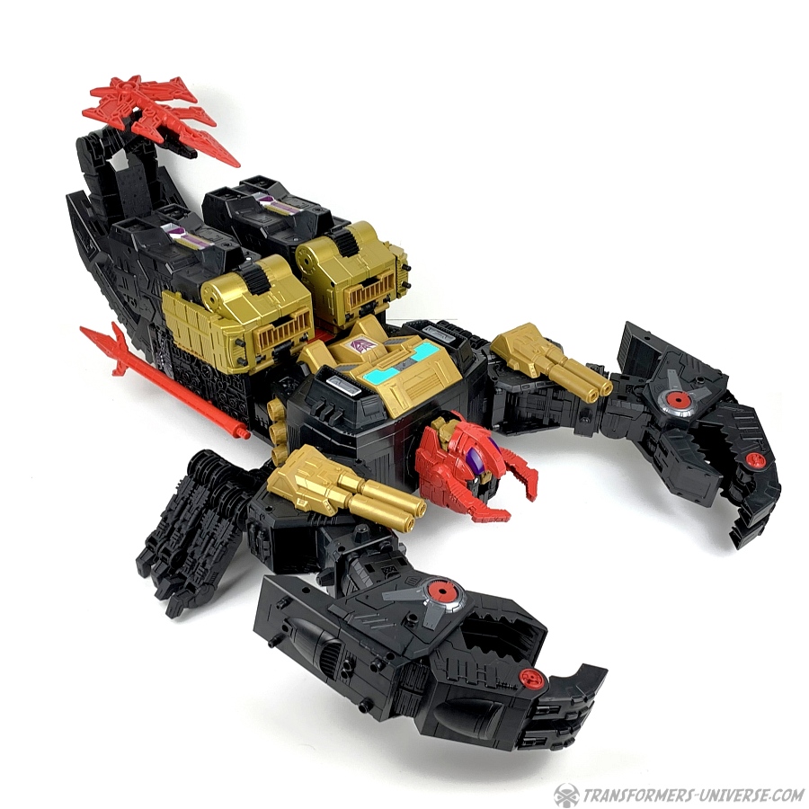 The scorpion looks pretty cool and while the tail and stinger are possibly a bit small, you can attach the tip of his Tyrant spear to make it larger. The rest of the spear can be attached to the sides. Eight scorpion legs unfold from underneath and while they are not really strong enough to lift the entire body, they give a good impression of doing so. Each legs is individually articulated. The robot’s head becomes the scorpion’s head, but the helmet is pushed down (and flips out an additional plate) to hide the robot’s face. As mentioned above, there is a sort-of cockpit for the Titanmaster figure underneath the robot’s chest plate, which is now on top of the scorpion.