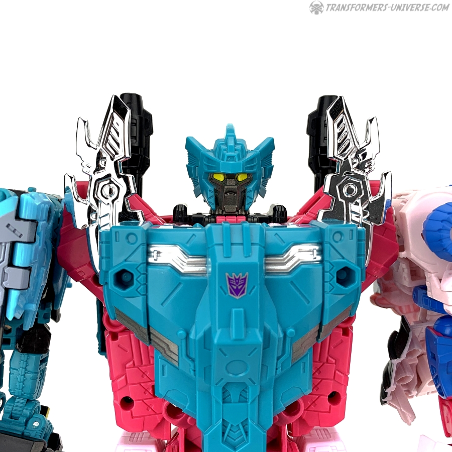 The main difference between King Poseidon / Piranacon and the other combiners is, of course, that there are actually six members, but only five combine into the actual robot. The sixth member becomes a weapon for the combiner to wield (the Seacons were actually advertised as the “Targetmaster Seacons” during G1). Which is a very cool idea in theory and worked reasonably well in practice in the days of G1 Piranacon, but comes with some complications for this larger Generations Selects version. Mainly that the weapons resulting from Deluxe-sized robots are really too heavy and unwieldy for the combiner to properly hold. The design with the weapons using the combiner port to plug into the back of the combiner’s hands is pretty well done, but no matter how you put the combiner together, the weapon (any of the five) is just too heavy to actually point without the help of a display stand.