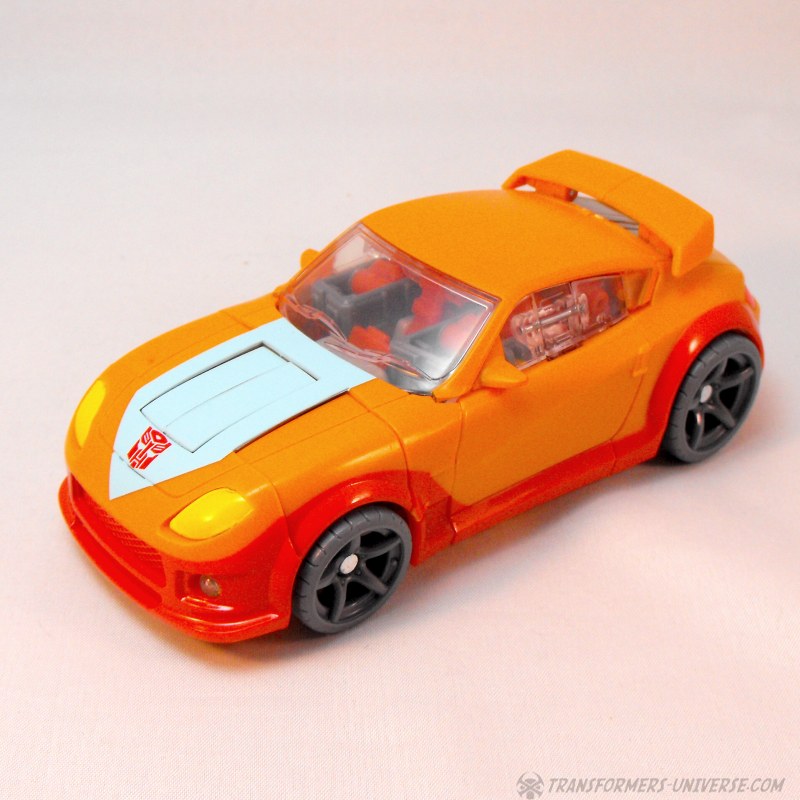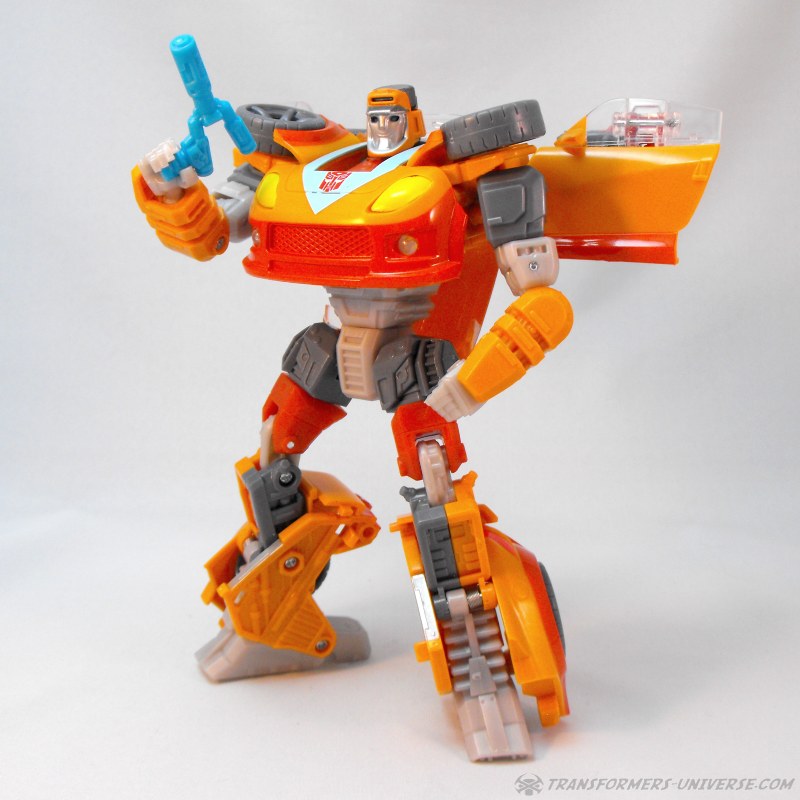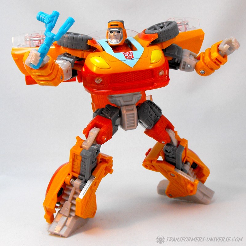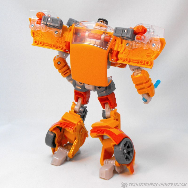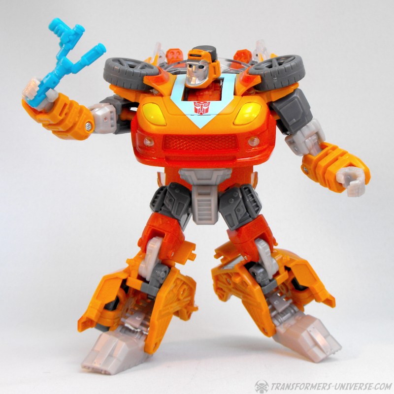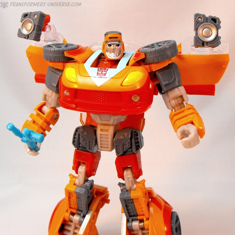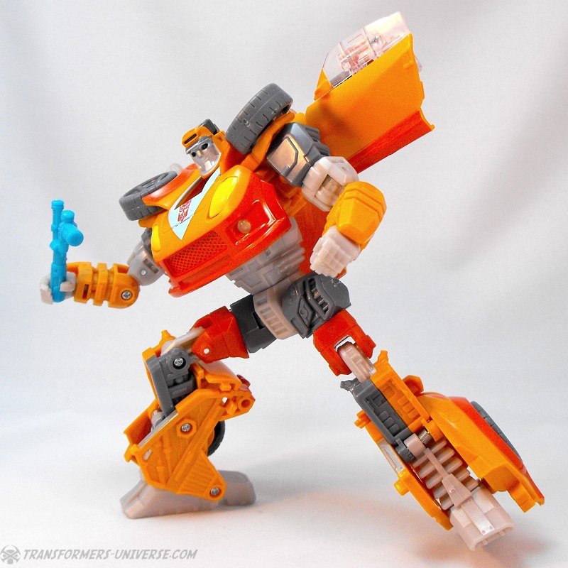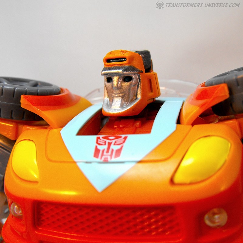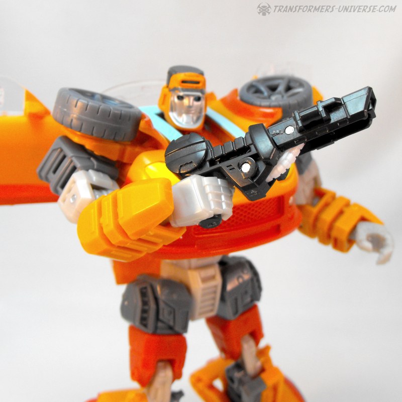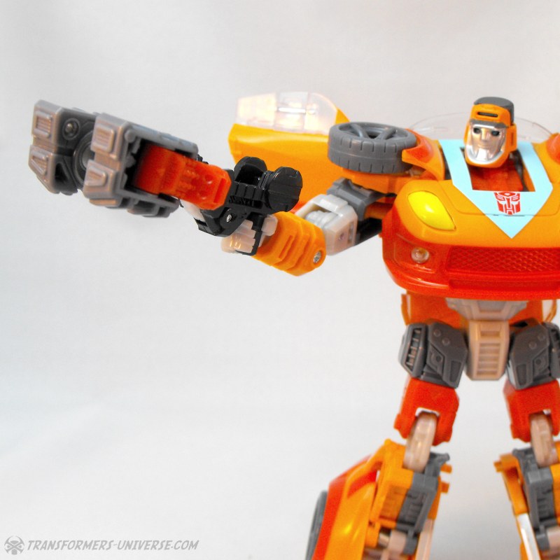 Remarks: Wheelie is a repaint with a new head of Special Ops Jazz, so this review here will focus on the changes. Wheelie is, of course, a homage to G1 Wheelie and has gotten an appropriate orange paint job. He has also gotten a new head, which is pretty much a dead ringer for the head of the TV version of Wheelie (which the G1 toy didn’t really resemble much). Finally, Jazz’ gun was replaced by a blue slingshot, loosely resembling the weapon Wheelie wielded in the 1986 Transformers movie (though he also used a gun later on). The slingshot can also function as a kind-of gun, though it looks better in its “primary” mode.