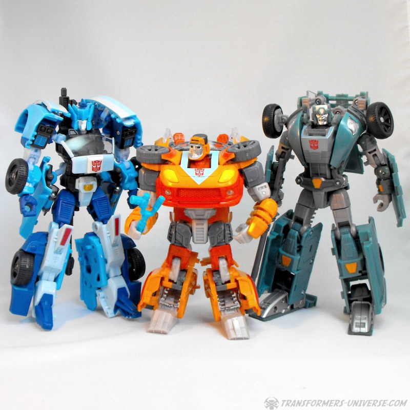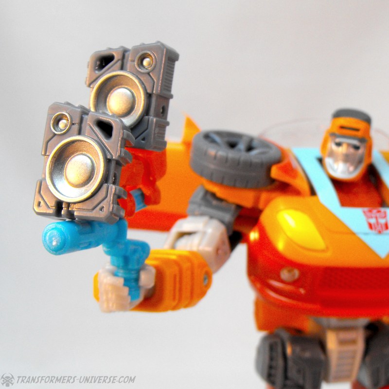 Wheelie retains the speakers Jazz had hidden inside his car doors and can unfold them in robot and car mode. The speakers can also link with his weapon… somewhat. Doesn’t look great, though. Anyway, the mold makes a pretty good Wheelie, the only problem being that Wheelie was always the smallest of the Autobots (not counting cassettes) and Jazz is among the tallest Deluxe figures in recent years. That can be fixed, though, by not unfolding his legs all the way , making him a good deal shorter than other Deluxe-class Season 3 characters in the Generations line-up.