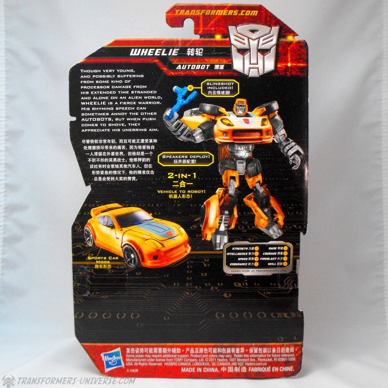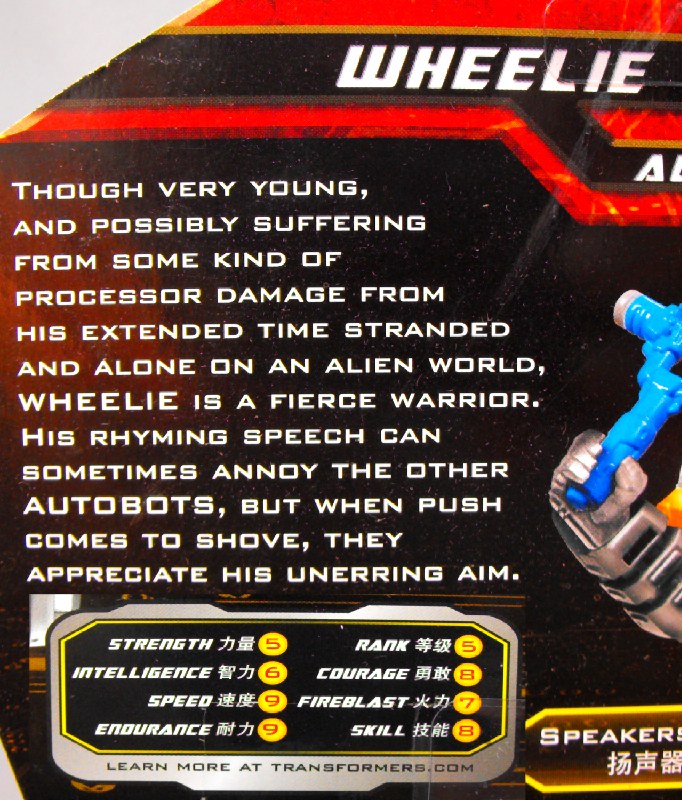 Though very young, and possibly suffering from some kind of processor damage from his extended time stranded and alone on an alien world, Wheelie is a fierce warrior. His rhyming speech can sometimes annoy the other Autobots, but when push comes to shove, they appreciate his unerring aim.