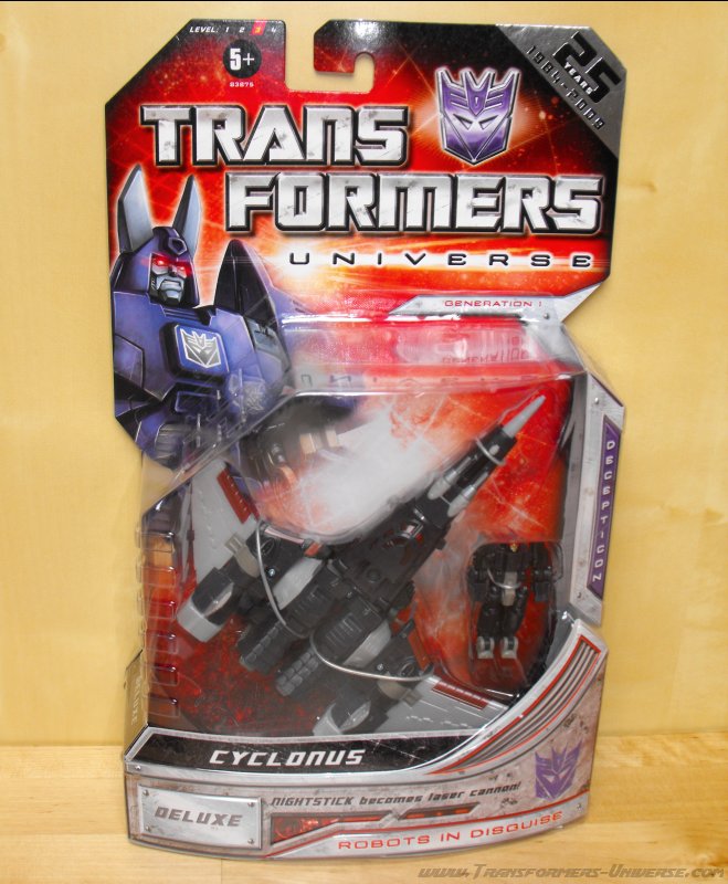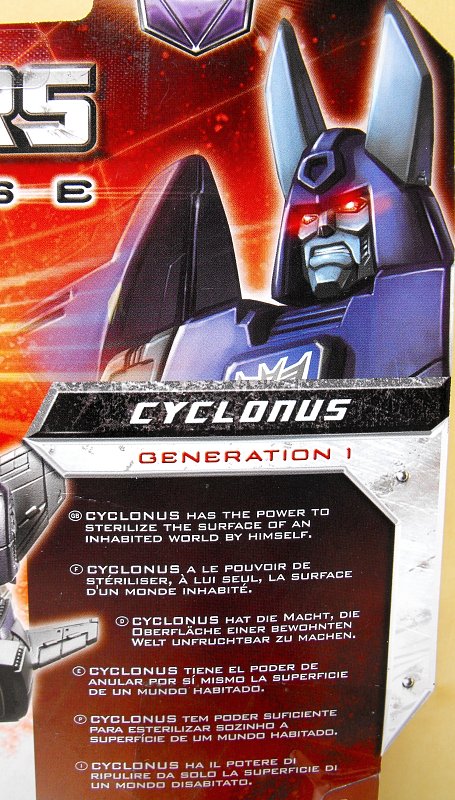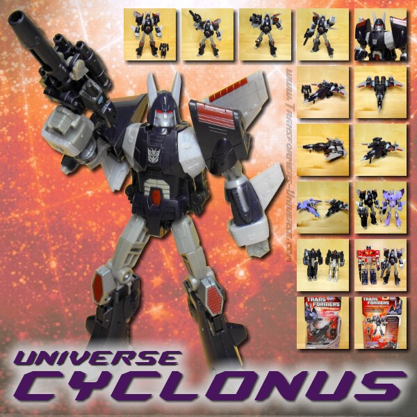 Constructed from the cast-off chassis of deactivated Decepticon warriors, Cyclonus was programmed by Unicron to be loyal only to Galvatron. Powered by nuclear engines, and a small fragment of his creator's supernatural power, Cyclonus wields enough might to sterilize the surface of an inhabited world by himself. He never unleashes this power without his commander's leave, however, and he focuses all of his energy on ensuring that Galvatron is obeyed without question by those under his command.