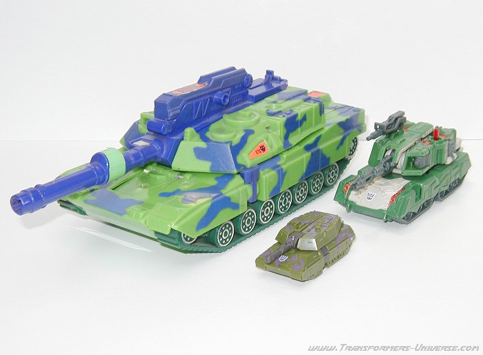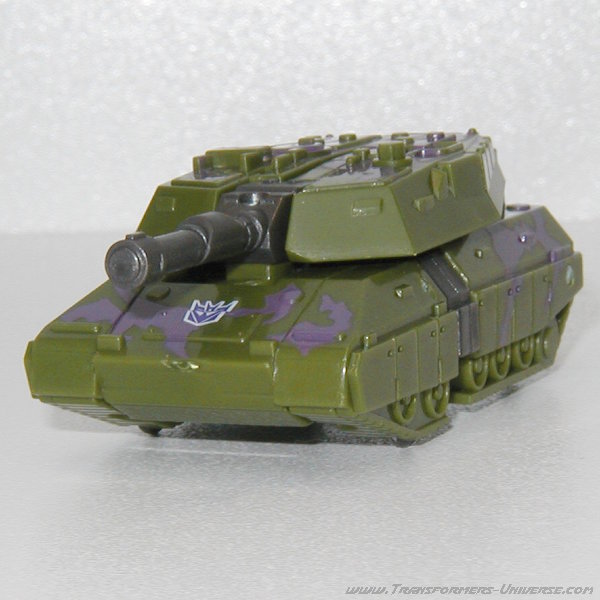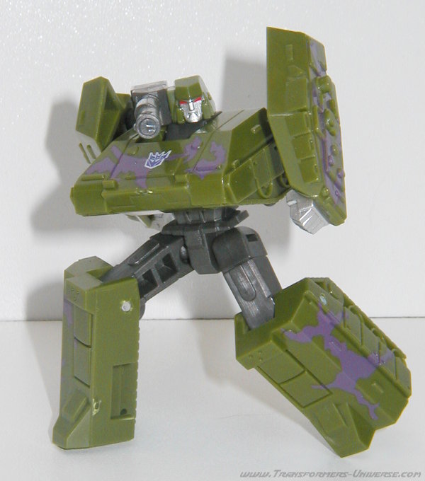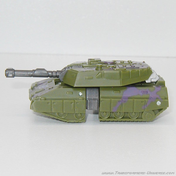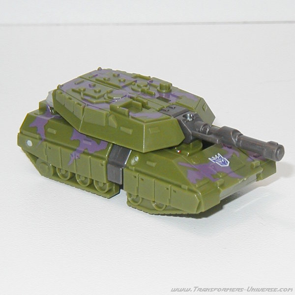 Alternate Mode: Megatron transforms into a pretty realistic-looking green tank with purple cameo patterns on it. The detailing on the vehicle is pretty extensive for the size-class and the tank looks great overall. Play value is, of course, limited here. The tank turret can't turn and the gun can't be raised. Then again, G2 Megatron couldn't do any of these things, either, so I can't really complain. So overall, a good vehicle mode, if a bit unspectacular.