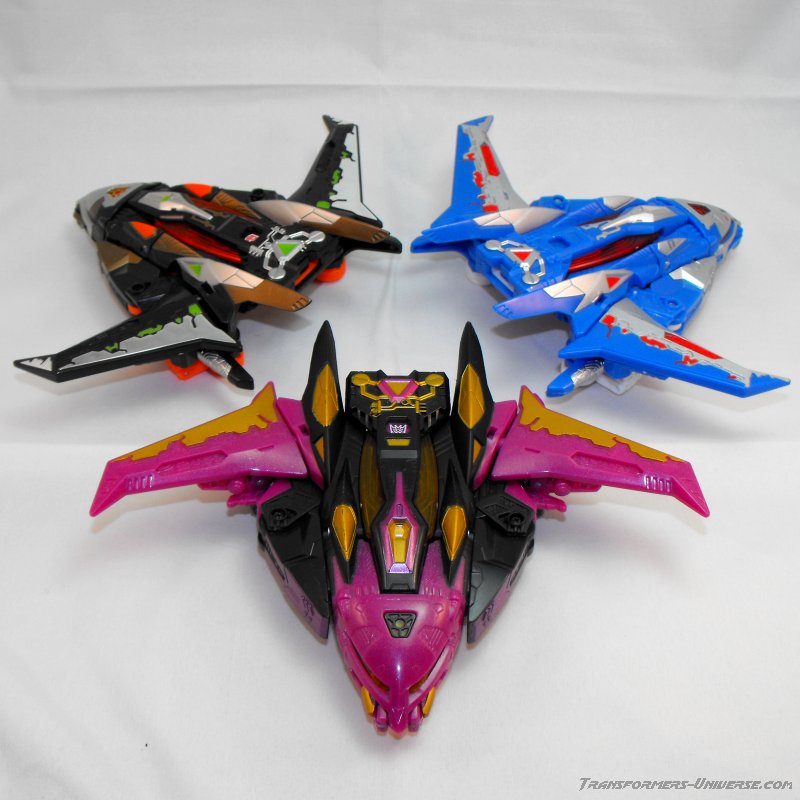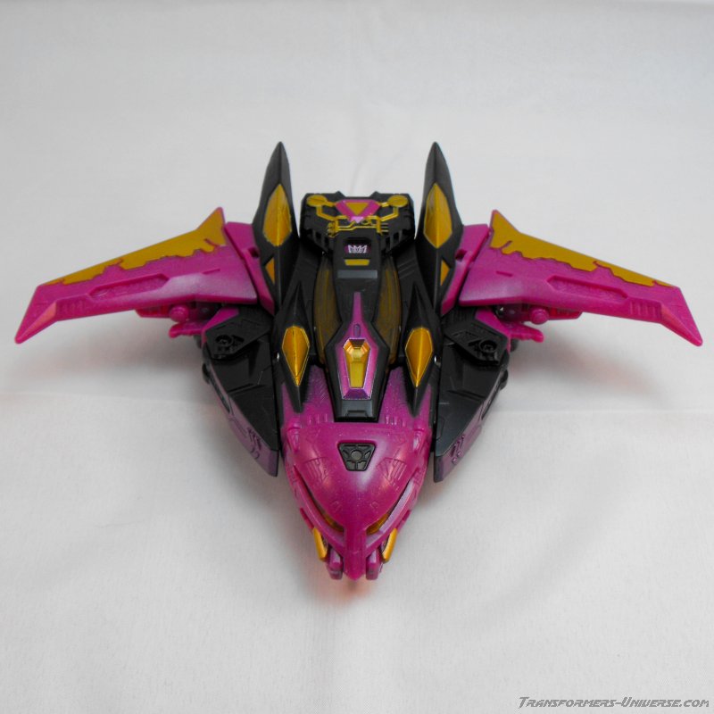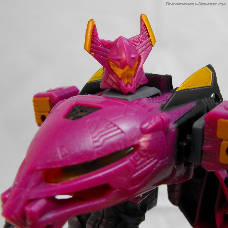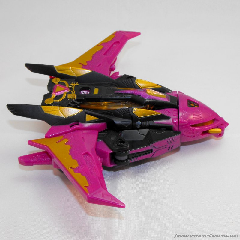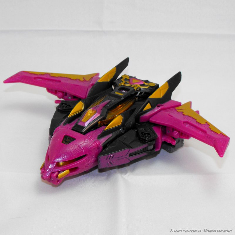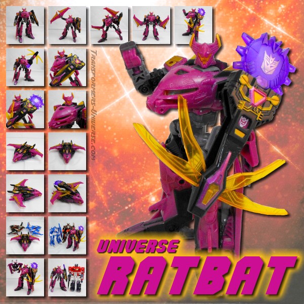 This version of Ratbat is heavily inspired by Ratbat's appearance in Dreamwave's War Within series, long before he became one of Soundwave's cassette warriors. The resemblance is not perfect, as that Ratbat was more a kind of glider than an actual jet, but it's close enough and Ratbat looks really good here. Unlike Scourge he retains Noisemaze's original head, which suits him quite well as it's a close match to the head he had in War Within (see the picture to the right of his stats). The figure is colored mostly black and dark purple, retaining the color scheme of the original G1 Ratbat.