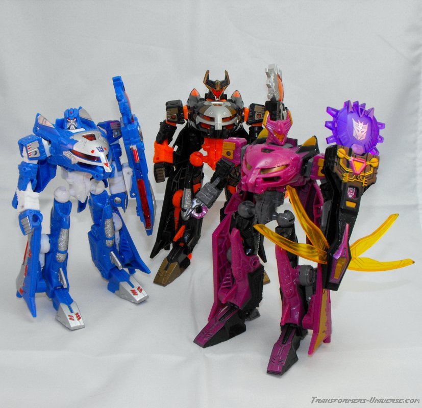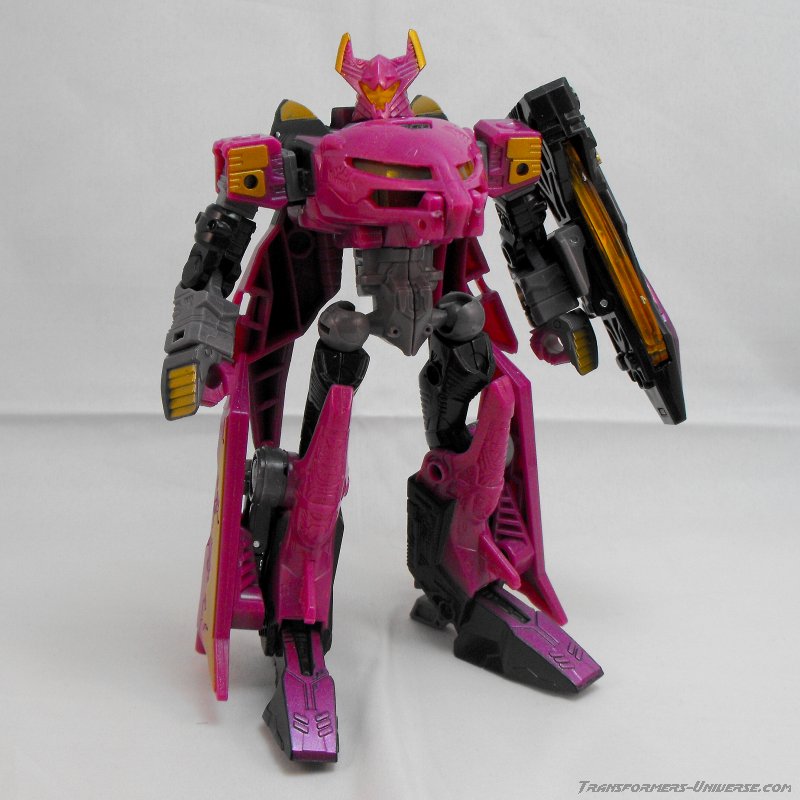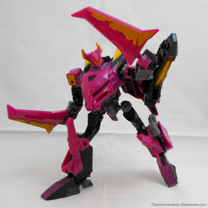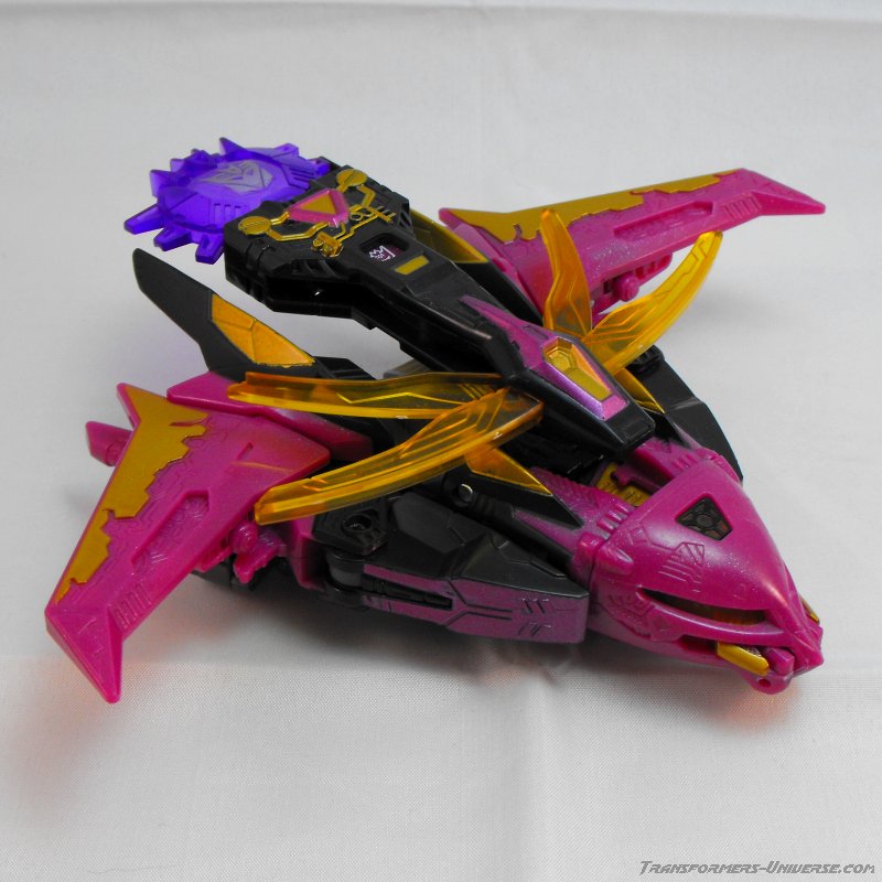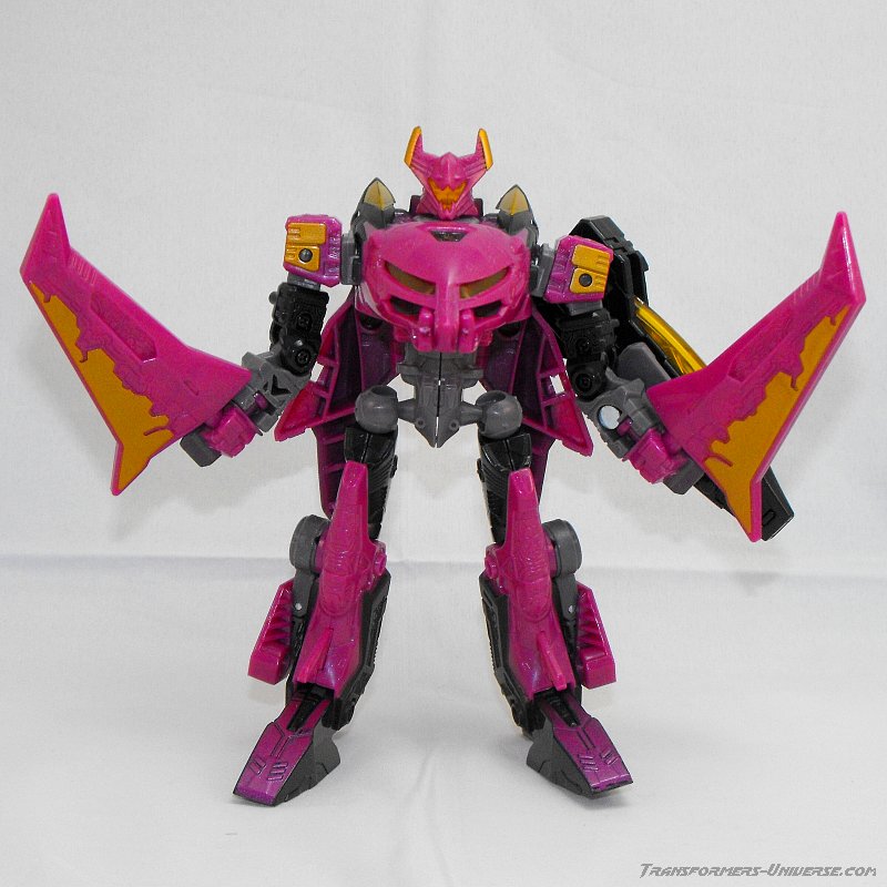 This version of Ratbat is heavily inspired by Ratbat's appearance in Dreamwave's War Within series, long before he became one of Soundwave's cassette warriors. The resemblance is not perfect, as that Ratbat was more a kind of glider than an actual jet, but it's close enough and Ratbat looks really good here. Unlike Scourge he retains Noisemaze's original head, which suits him quite well as it's a close match to the head he had in War Within (see the picture to the right of his stats). The figure is colored mostly black and dark purple, retaining the color scheme of the original G1 Ratbat.