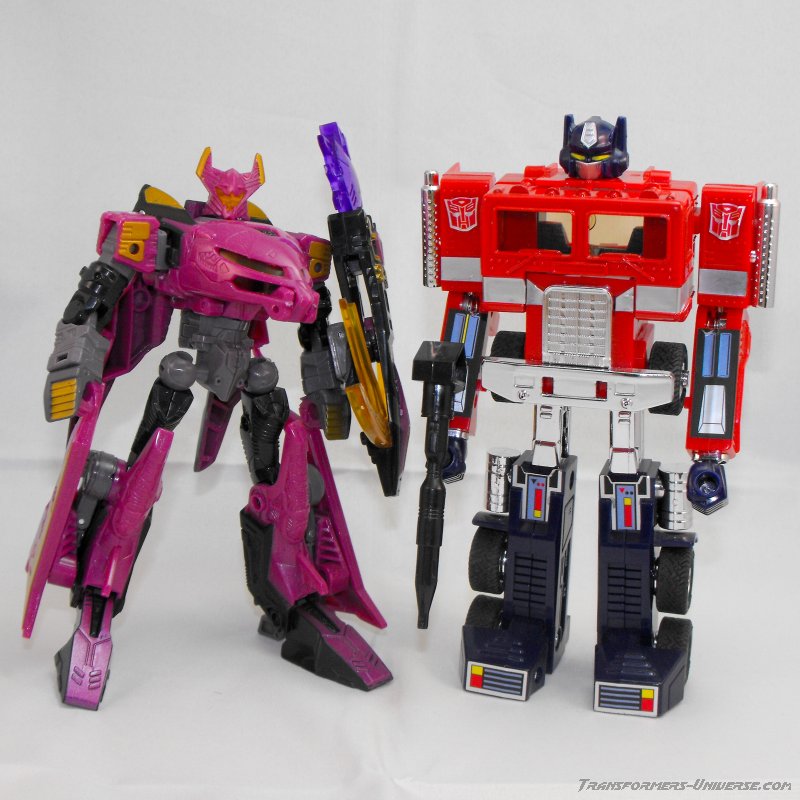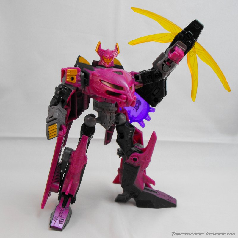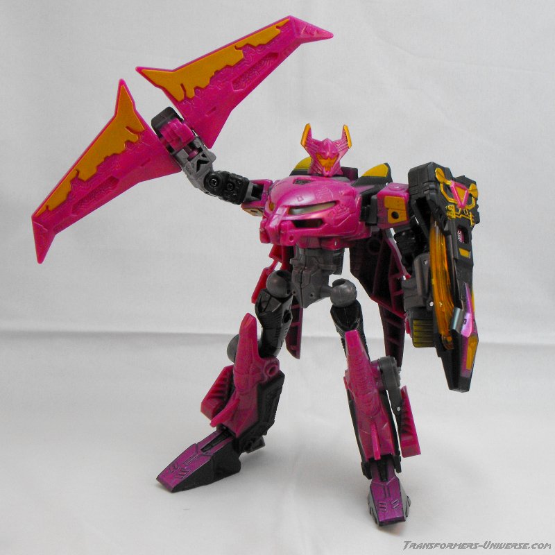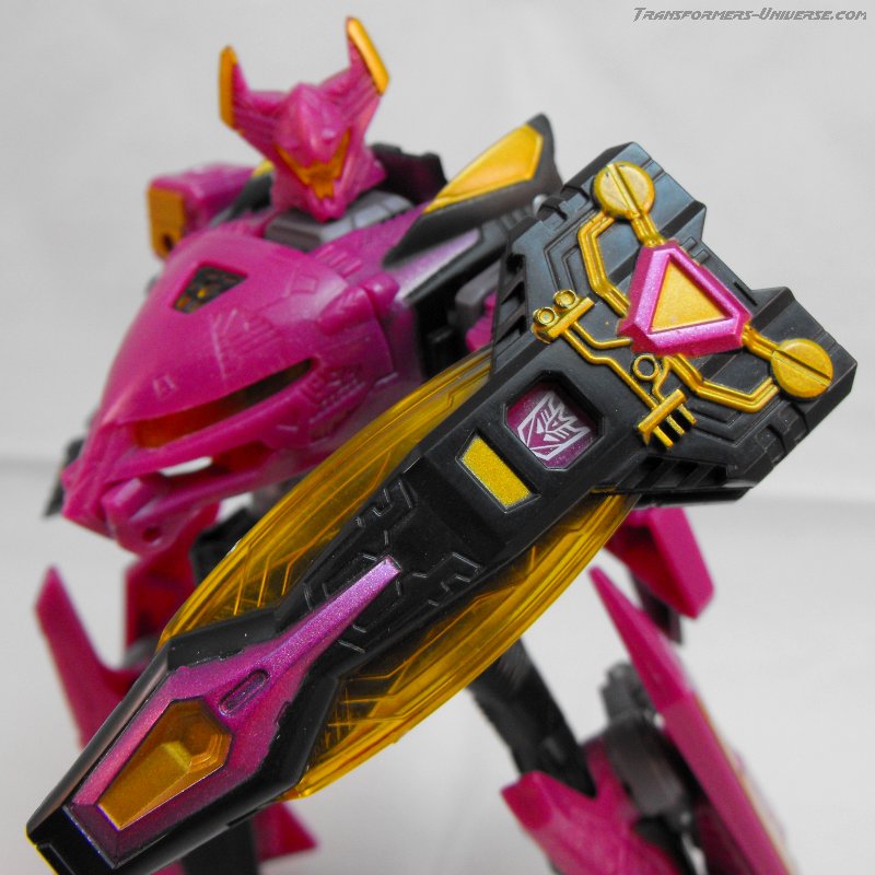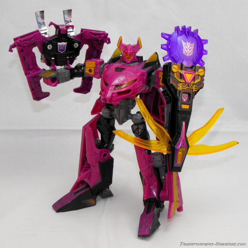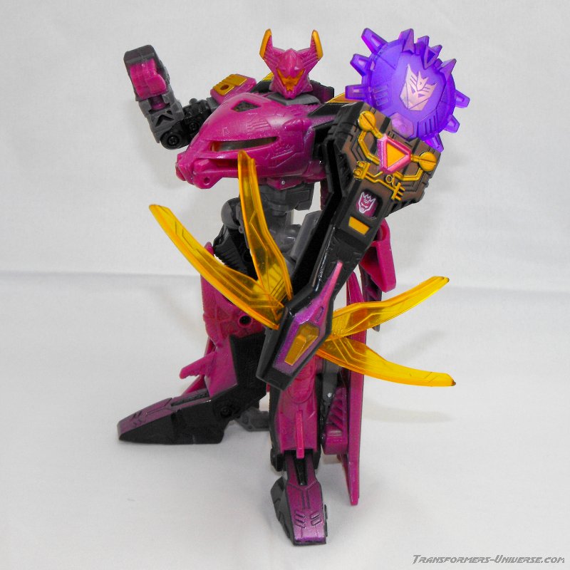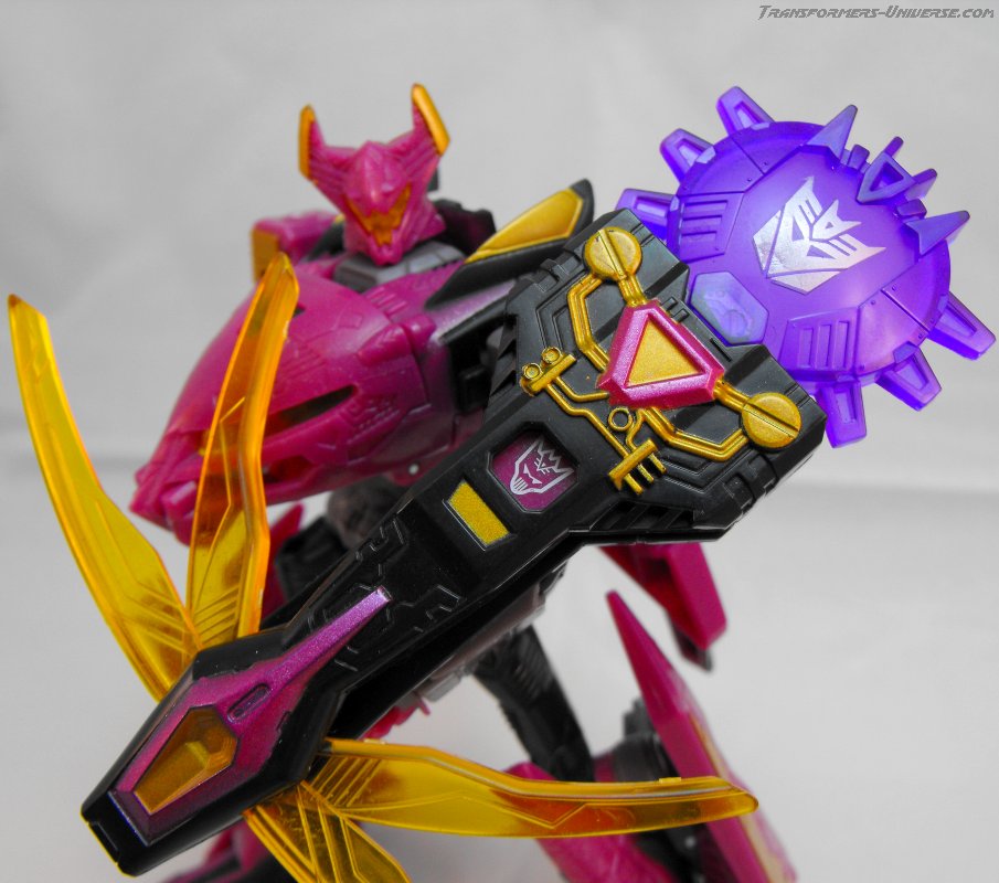 Well, that's pretty much it. A different paint job, a different name, everything else is the same. The same excellent figure with a great, alien look, great posability, nice sword weapons and no flaws worth mentioning. Oh, and one more thing. The original Noisemaze version had the gimmick of switching faction symbols. Without the Cyberkey inserted into his left arm, he was an Autobot, with the Cyberkey in he turned into a Decepticon (of course he was really neither). This gimmick was abandoned for Scourge, but retained for Ratbat. He is a Decepticon without the Cyberkey, but when the key is intered he displays the faction symbol of the Ultracons, the short-lived Decepticon splinter faction Ratbat led in the War Within series. A small, but very nice gimmick and a nod to all comic fans.