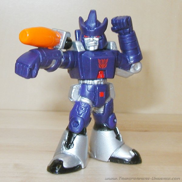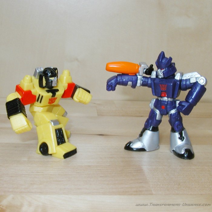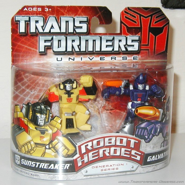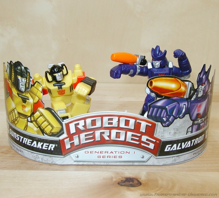 Strange pairings aside, both figures look pretty good. Sunstreaker is in a battle-ready pose that underscores his warrior character (though his smile could be a touch more sociopathic) while Galvatron has that semi-insane smile on his face and is posed with his gun ready to blast a planet apart or something. No complaints about either character, cute little Robot Heroes.