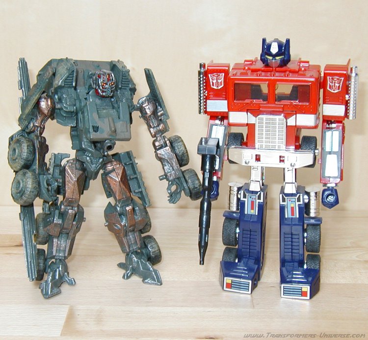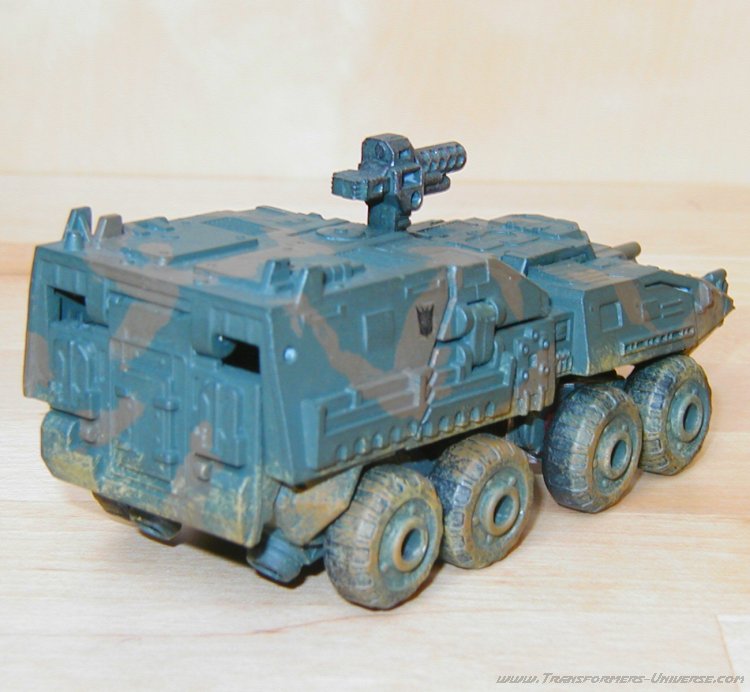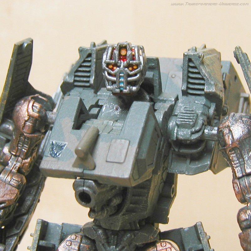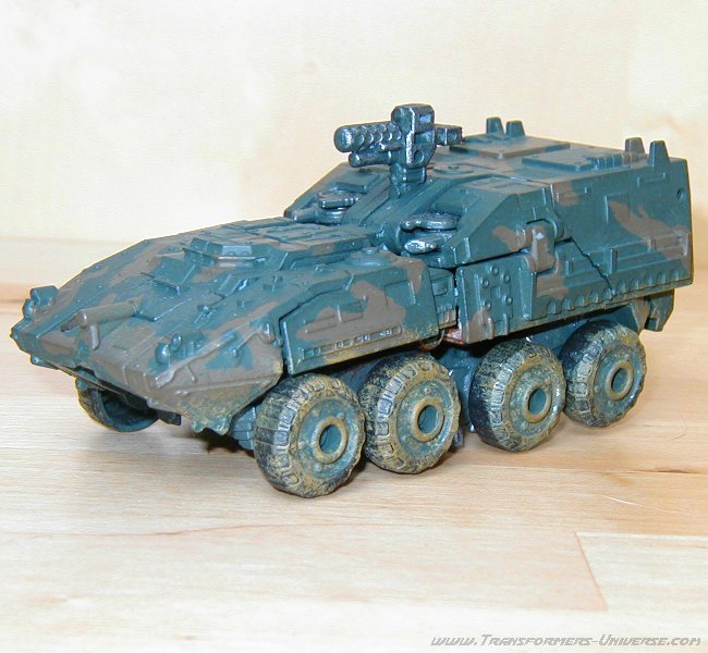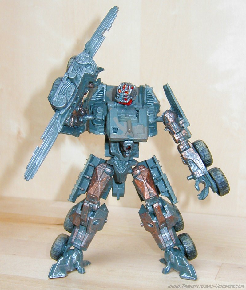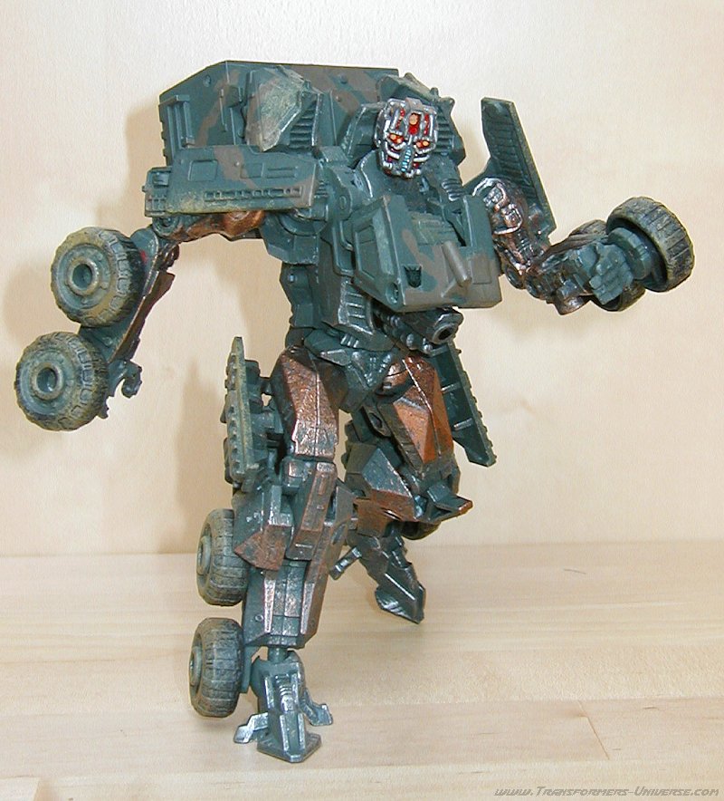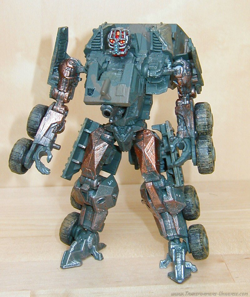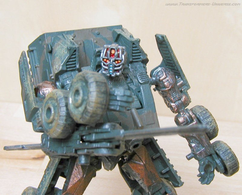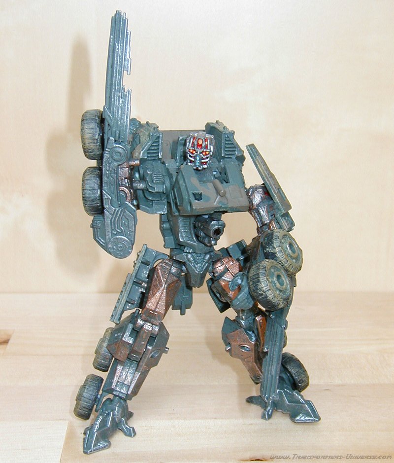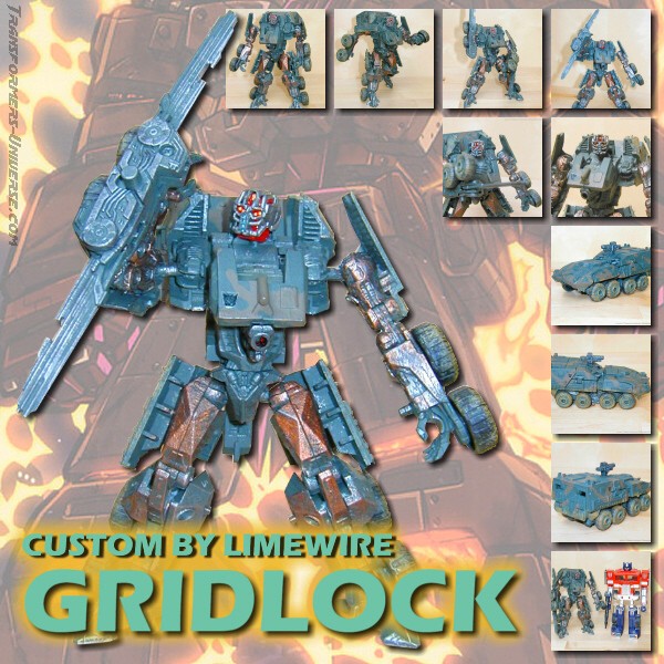 Remarks: Gridlock here is a custom-made repaint of Movie Wreckage with a different head (courtesy of Movie Landmine). So for the details of the figure, its posability, alternate mode and the other usual stuff, check out the reviews references above. Here we have just some words on the changes Limewire made. Now the Wreckage figure is a pretty good one, but the original suffered from a truly boring paint job. White with grey spots. The robot mode was made more interesting by the red limbs, but it was still not the most amazing paint job in the world. Limewire chose to give Gridlock a more military-style paint job in a green/brown cameo pattern, adorned by his traditional polished/scratched metal look. That alone serves to make Gridlock a lot more interesting visually than Wreckage.