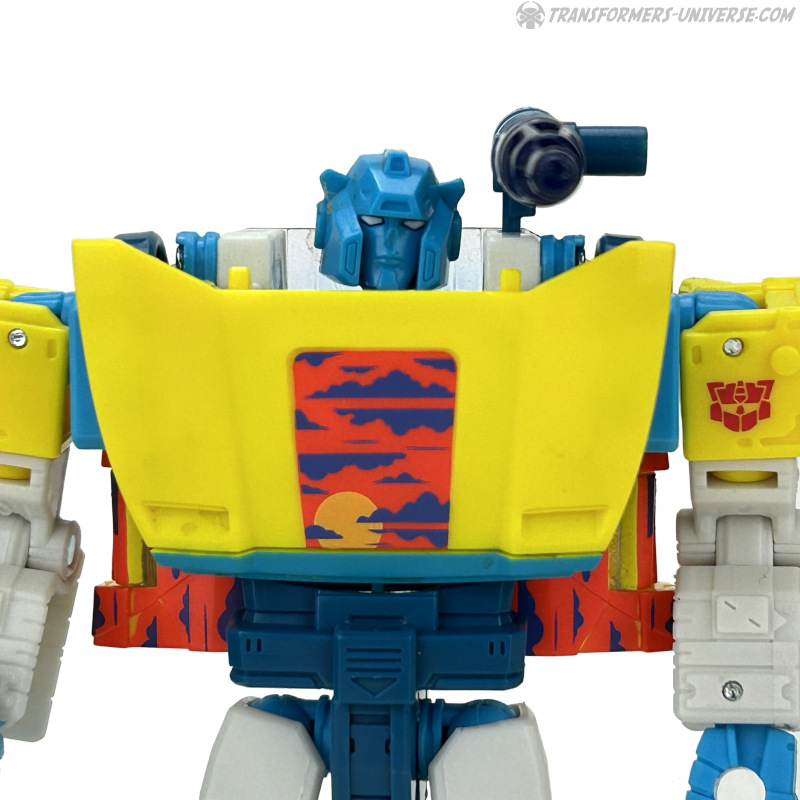 The only real change is the new paintjob and what a glorious paintjob it is. Sideswipe now has a bright, screaming yellow for his chestplate and shoulders, as well as Power Core Combiner port blue for his shins, hands, and head. His weapons are a somewhat darker shade of blue. And, of course, he has a sunrise, complete with red sky and clouds, painted on his chest. Why? Who cares, it looks awesome! A G2 Autobot symbol has been placed on his left shoulder.