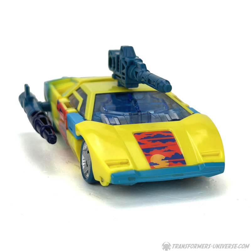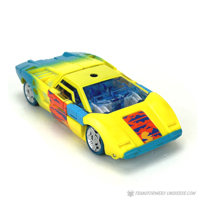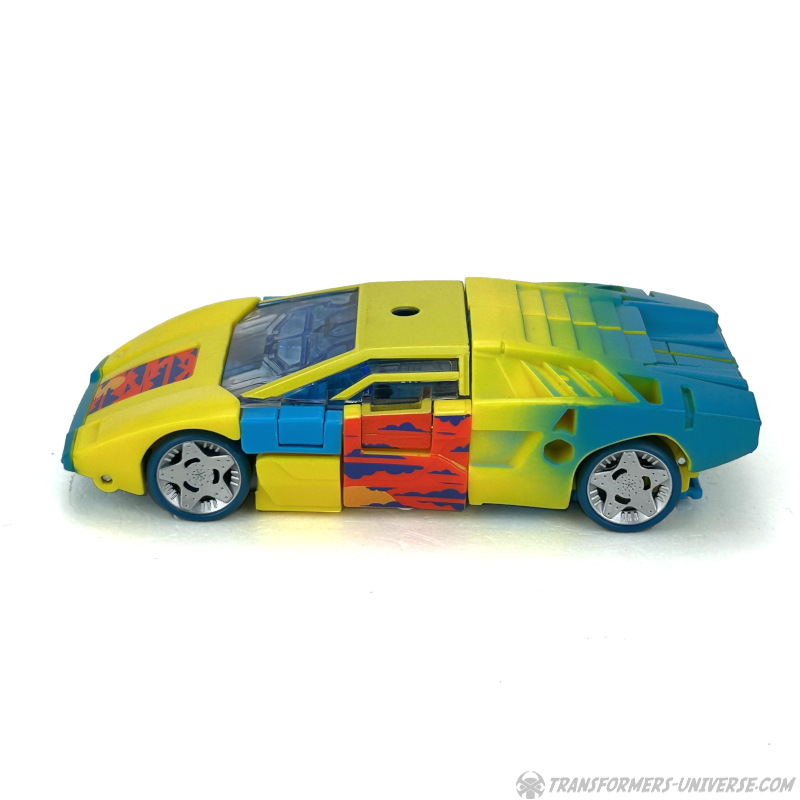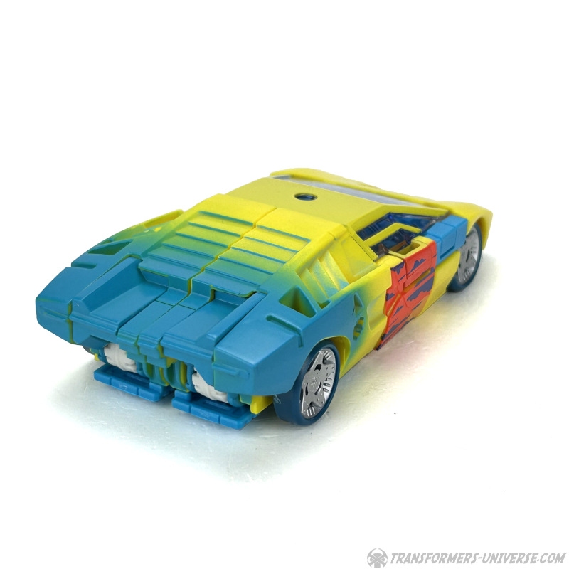Alternate Mode: No surprise here, Sideswipe still transforms into a car somewhat resembling a Lamborghini Countach LP500S but without any pesky licensing issues. Here, too, the only new thing is the paintjob and you have that glorious sunset both on the hood and on the doors, as well. Most of the car is yellow, fading into blue near the rear. Like many recent Transformers figures, there is a bit of a color gap between the solid yellow hood and rear on one side and the painted yellow roof, but it’s not as noticeable here as, for example, on Earthrise Sunstreaker.