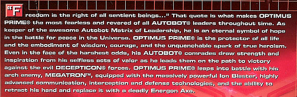 The only thing missing would be Optimus' trailer, but for a robot this size it would have to have been a monster, so I can understand why they didn't include it (though the idea of a large battle station emerging from it does hold a certain interest). The Japanese version of this toy apparently included a cardboard trailer.