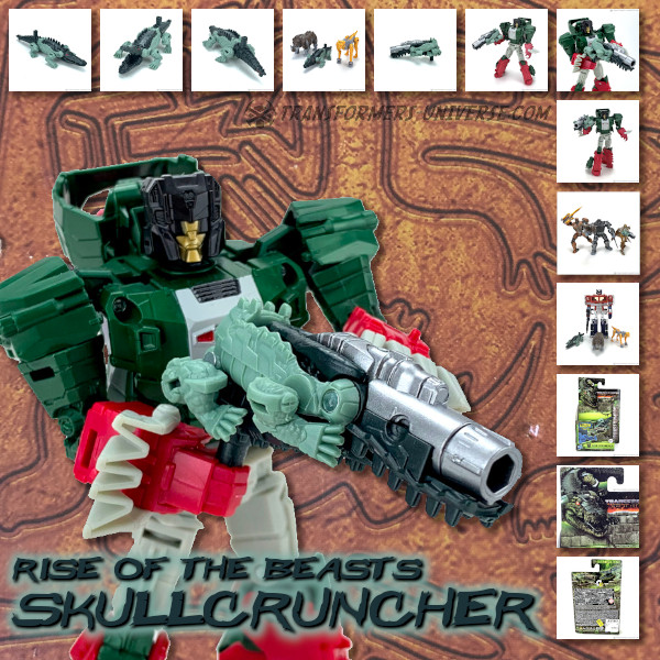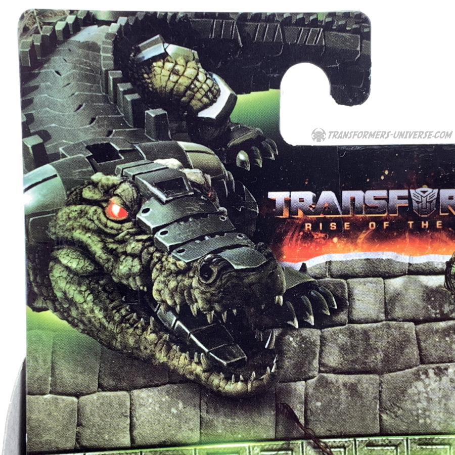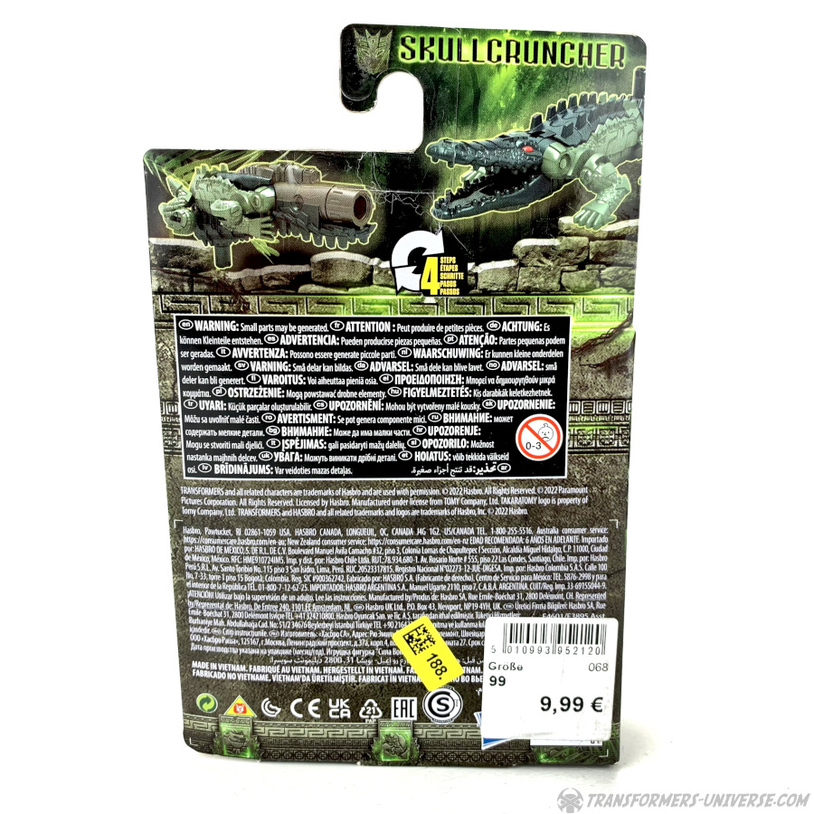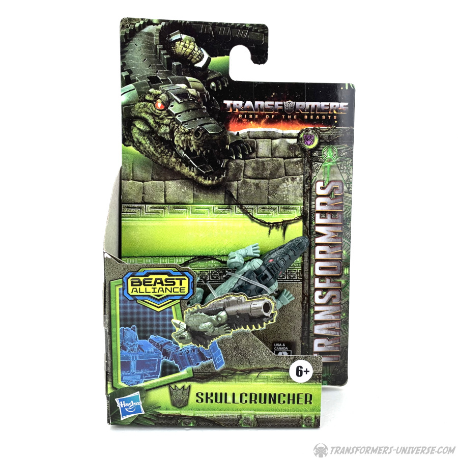 Remarks: As mentioned above, Skullcruncher does not actually appear in the Rise of the Beasts movie, which makes the question where he belongs rather academic. His packaging labels him as a Decepticon, actually the ONLY Decepticon in the entire Rise of the Beasts line (and no Decepticons appeared in the movie, either). His packaging artwork, however, shows him being wielded by Optimus Prime, an Autobot, and his other figure, the Beast Combiner, is packed with Optimus Primal, a Maximal, so take your own pick what faction symbol you’d prefer on him. According to a designer, Skullcruncher was designed with the Actionmaster companion Gatorraider in mind.