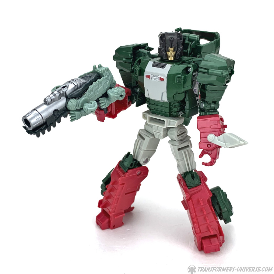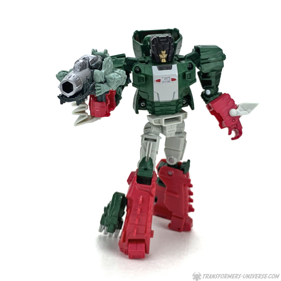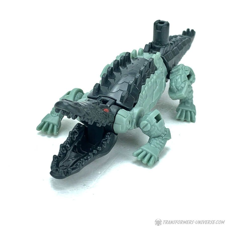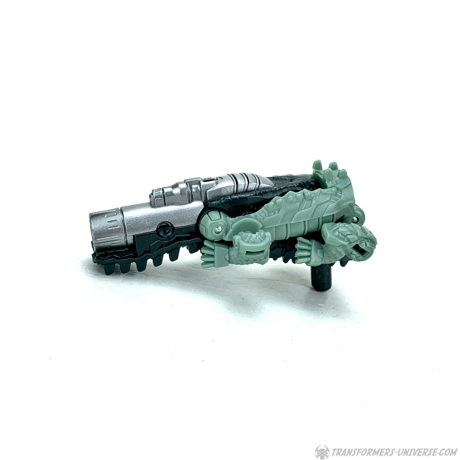 Weapon Mode: If you remember the aforementioned Beast Wars Basic Megatron, you might remember that his crocodile tail became a blaster. Well, in Skullcruncher’s case the tail plus the rest of the crocodile becomes a blaster. The transformation is pretty straightforward and the resulting blaster still has several visible animal parts, primarily the legs, visible to the beholder. A 5mm handle makes it compatible with most Transformers figures past and present, while a hole in said handle means it can also attach to Mini-Con Powerlinx sockets. The muzzle is compatible with many blast effect parts, too.