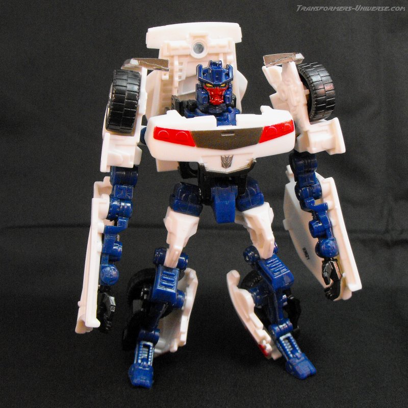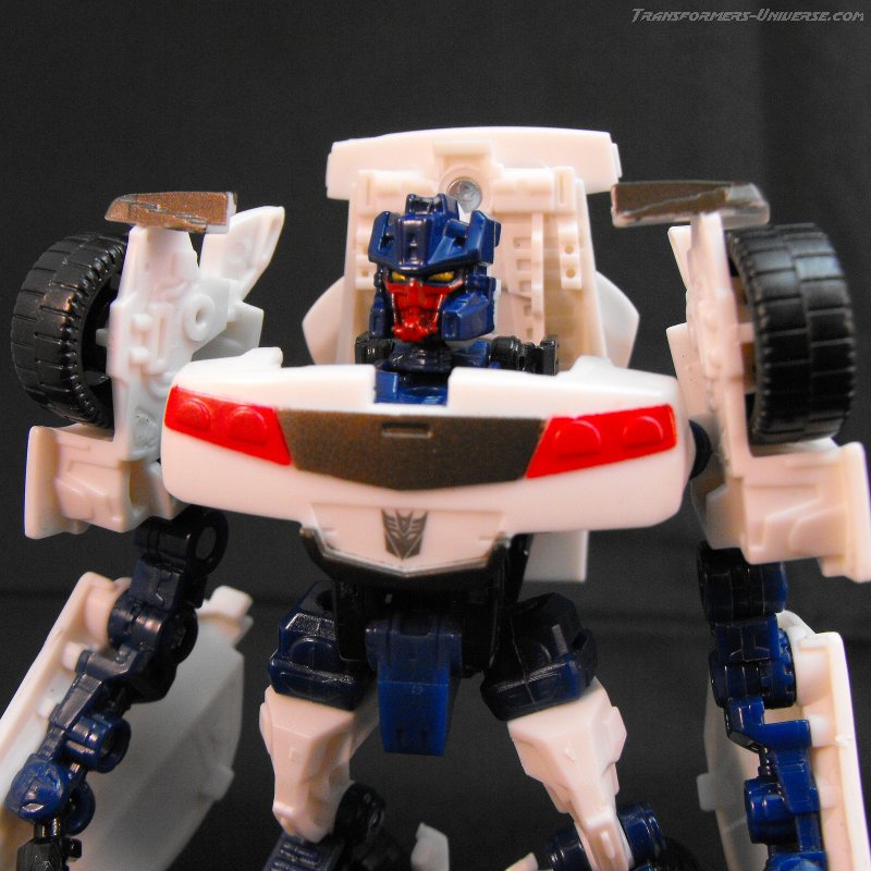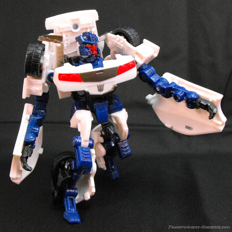 Vehicle Mode: The original G1 Breakdown became a white Lamborghini. ROTF Brakedown has downsized to a similar-looking white sports car, somewhat shorter in appearance (one might say ‘stunted’, ha!). While this vehicle is actually a bit bigger than the original Breakdown’s vehicle mode, it doesn’t look quite as sleek. Sculpt and detailing is okay for a figure this size, but little more than that. So bottom line: A decent, if somewhat unspectacular vehicle mode.