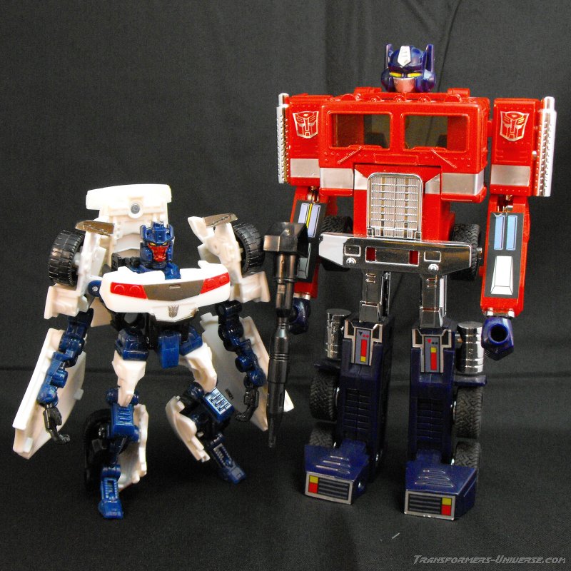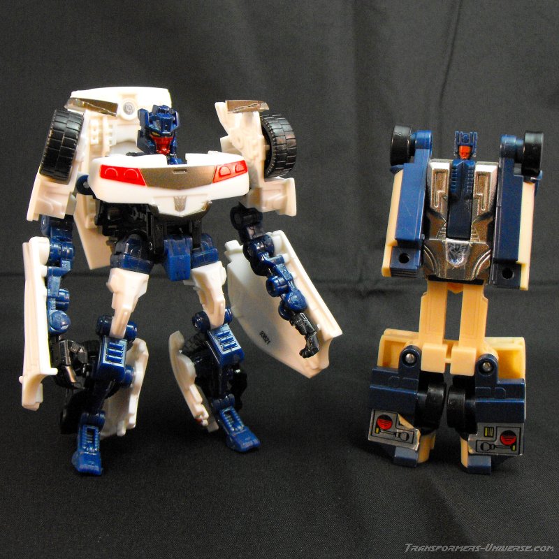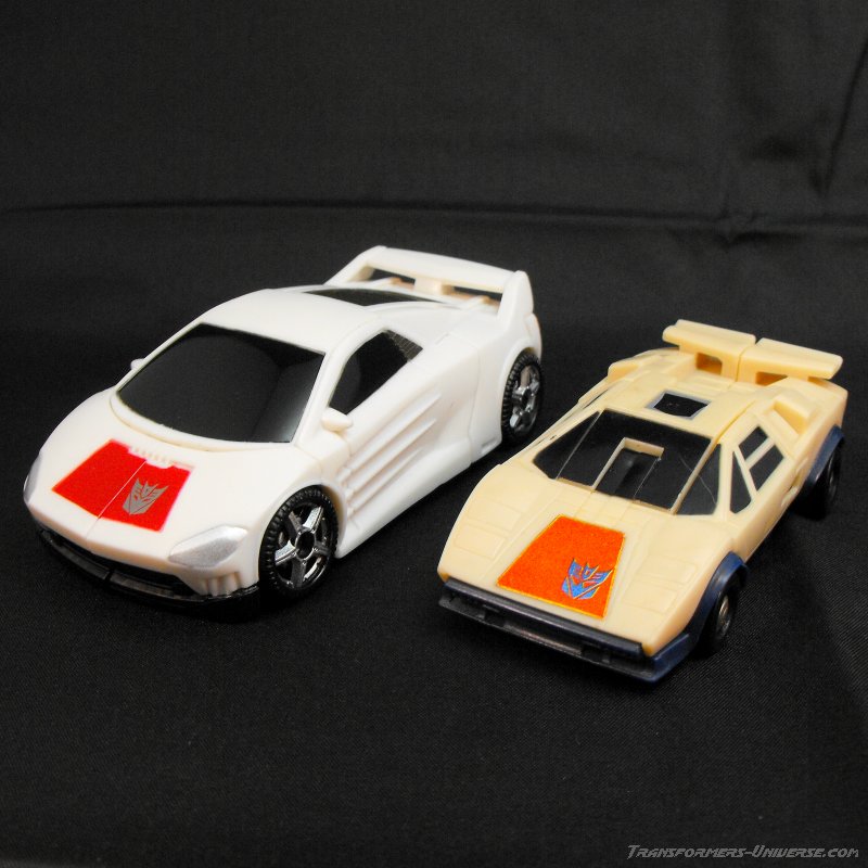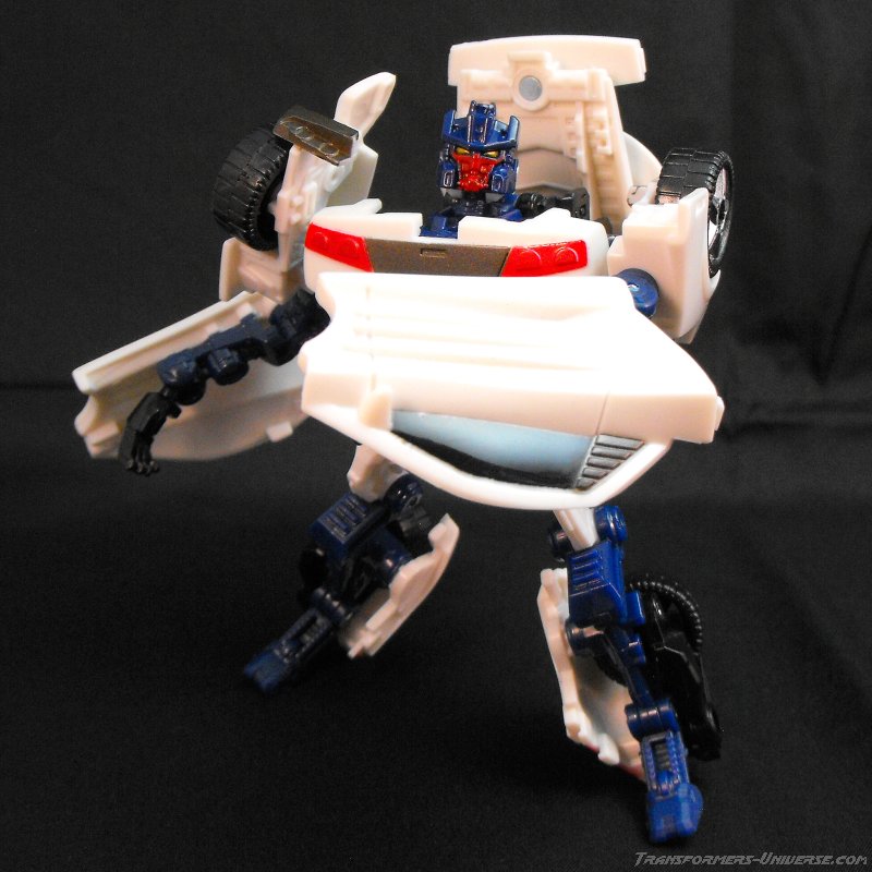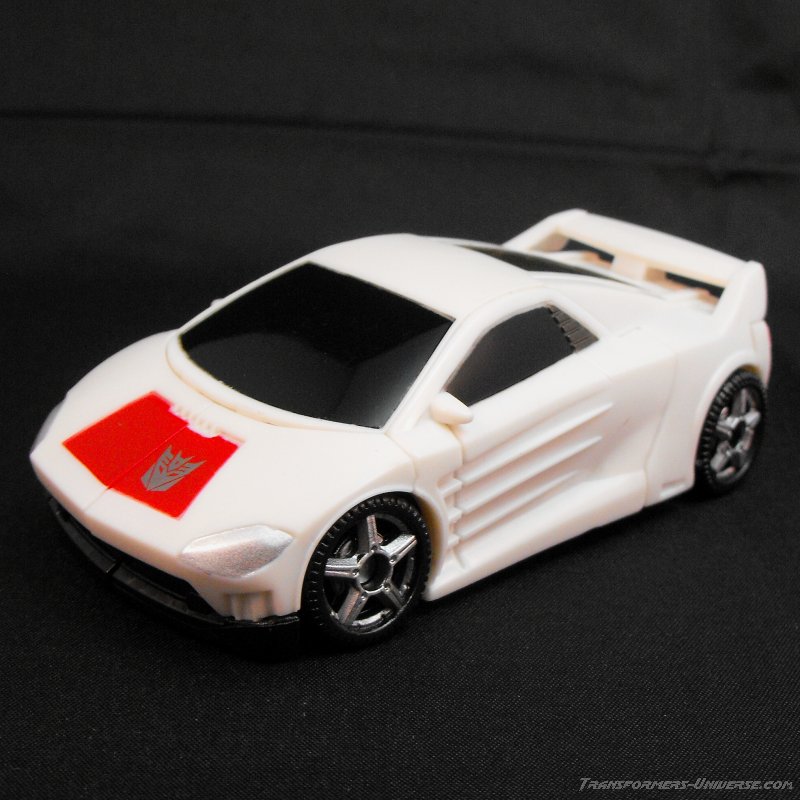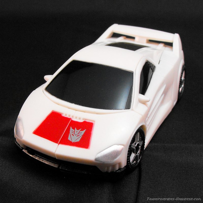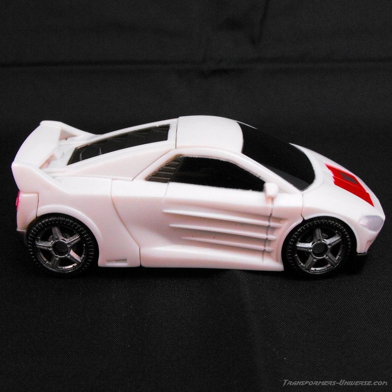 Vehicle Mode: I have seen some great vehicle modes in my time, but this scout class figure surpasses many of the nicer deluxe models. The car itself is based off of a Lamborghini of sorts, very much similar to his original toy. The color scheme is a simple white with a red panel on his hood, black windows, and a gun metal gray over his engine compartment.