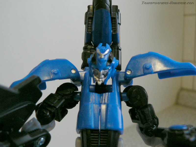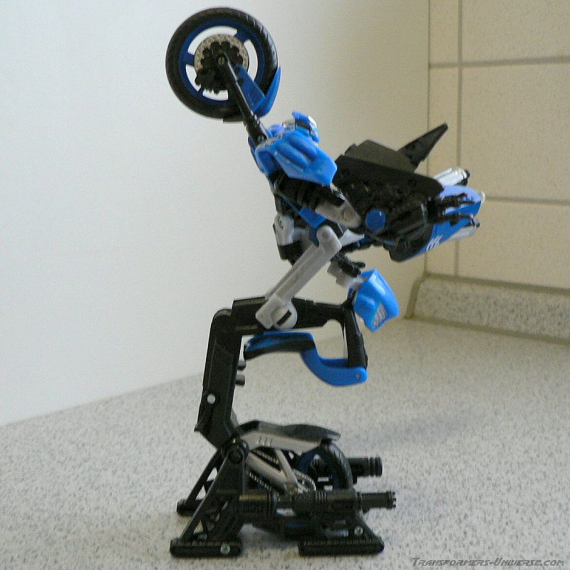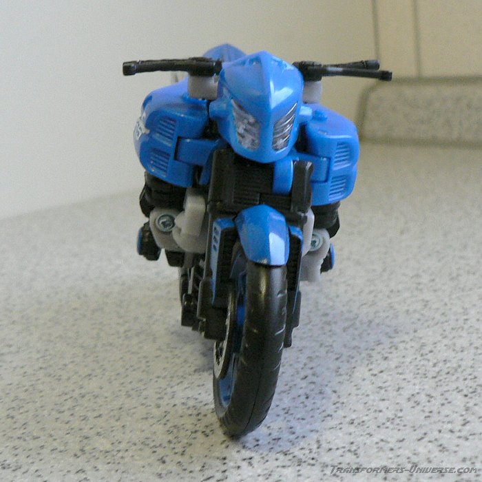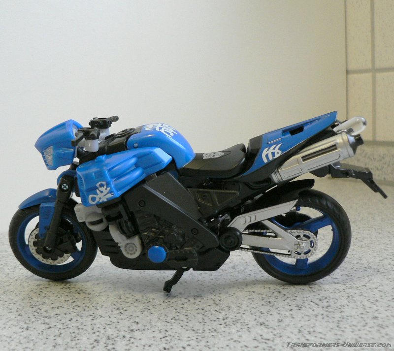 Vehicle Mode: Chromia transforms into a blue motorcycle. Now I'm not a motorcycle expert, so I have no idea what kind of model she's supposed to be and how close she mirrors her real-world counterpart. The motorcycle itself isn't bad, but it doesn't really work for me, either. The front portion is a bit too wide for my taste. I do like the Cybertronian glyph, but that's pretty much it. Like I said, not bad, but nothing special, either.