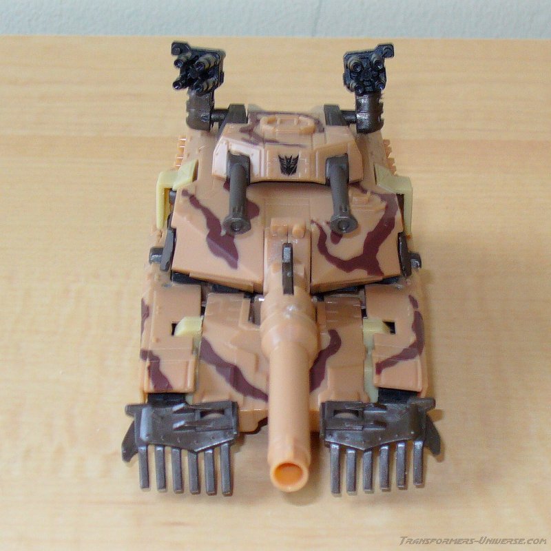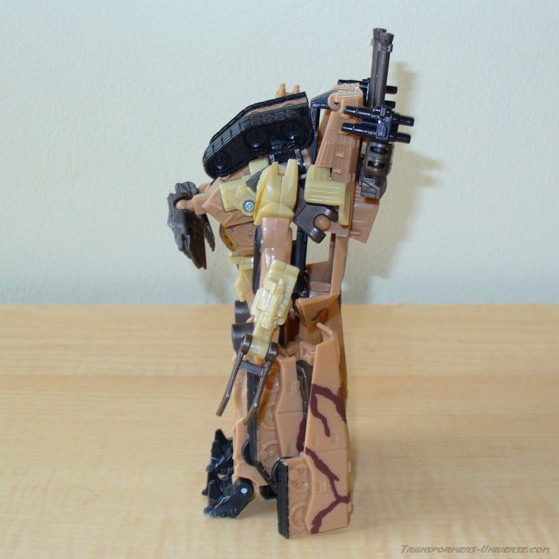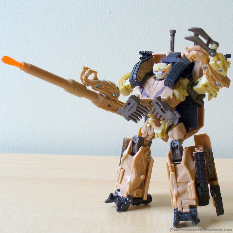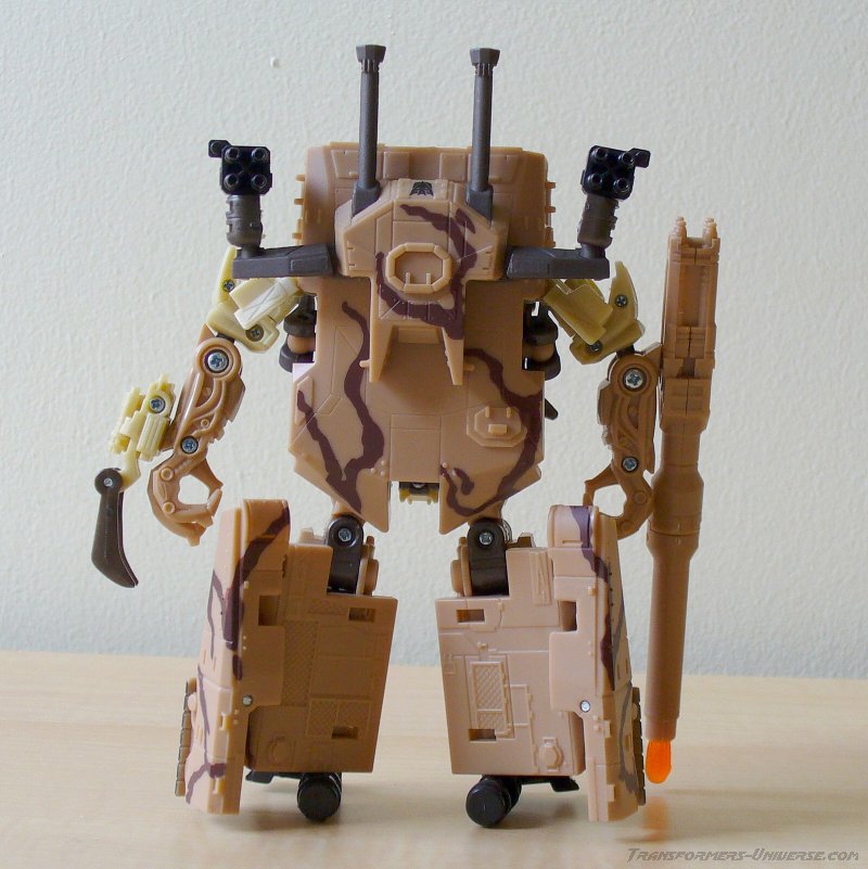 Robot Mode: I am introducing to you the new and improved Deluxe Class Brawl. The first time he appeared his shoulder tabs were incapable of holding the arms in position, but this time Hasbro has actually listened to us. His shoulder joints now work as they should. Aside from this retooling, this figure is the same Brawl mold with explicit detailing, but with a desert camouflage paint job. As I gaze upon Brawl, I still see someone who is ready for war. He has weaponry on nearly every piece of his body; only the leader class mold has more. For he has a an arm cannon, some sickle shaped claws, two machine guns, and finally two quad-missile launchers with which to blast Autobots back to the Allspark. Due to the retooling his posability has gone up considerably, but the smallish foot print still gets in the way. However, since he is not an acrobat, he does not need to bend that much. He will probably just blow up what’s in his way long before he would move around it. Brawl’s retooled mold now shows what the Movieverse toy lines are about.