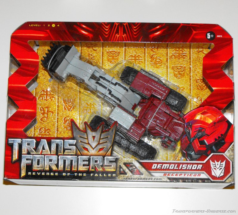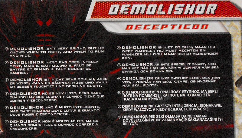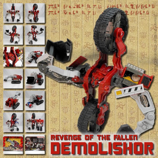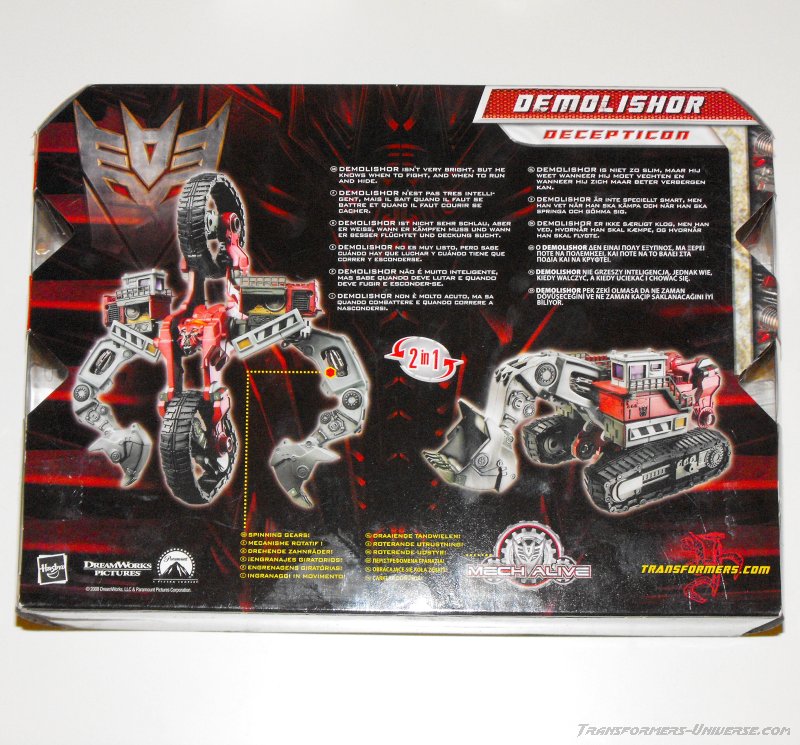 Remarks: Demolishor was one of the very first ROTF figures you could see pictures of and caused quite a bit of confusion. First off, people needed a while to figure out that he wasn't meant to have legs. Then the main question was for a long time: Can this Voyager-class figure combine with others to form a huge Devastator (no, he can't!). His name, too, was up in the air for a time, as Scavenger was considered a possibility, too (and the Devastator-component ended up being called that). The first thing I thought when I saw him, though, was how much he resembled Gizmoduck from Duck Tales. Demolishor also features prominently in the ROTF movie trailers, but in the actual movie he was finished off in a matter of minutes and then coldly executed by Optimus Prime. A Demolishor-twin (Scavenger, I presume) later appeared as part of Devastator, but met with no better fate.
