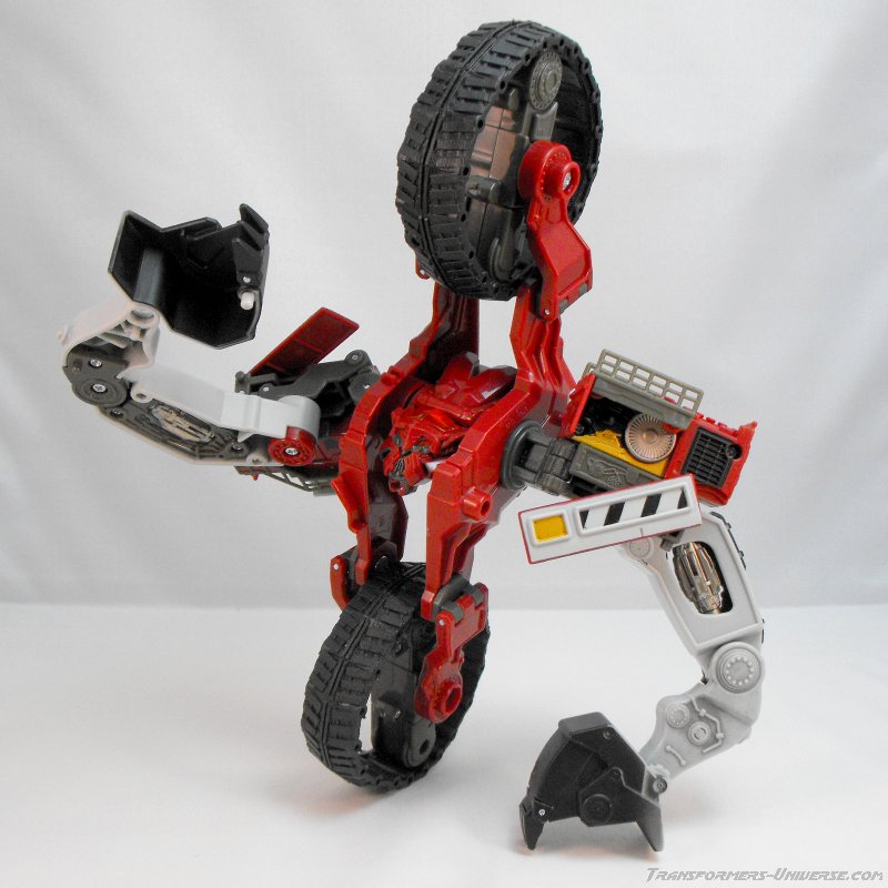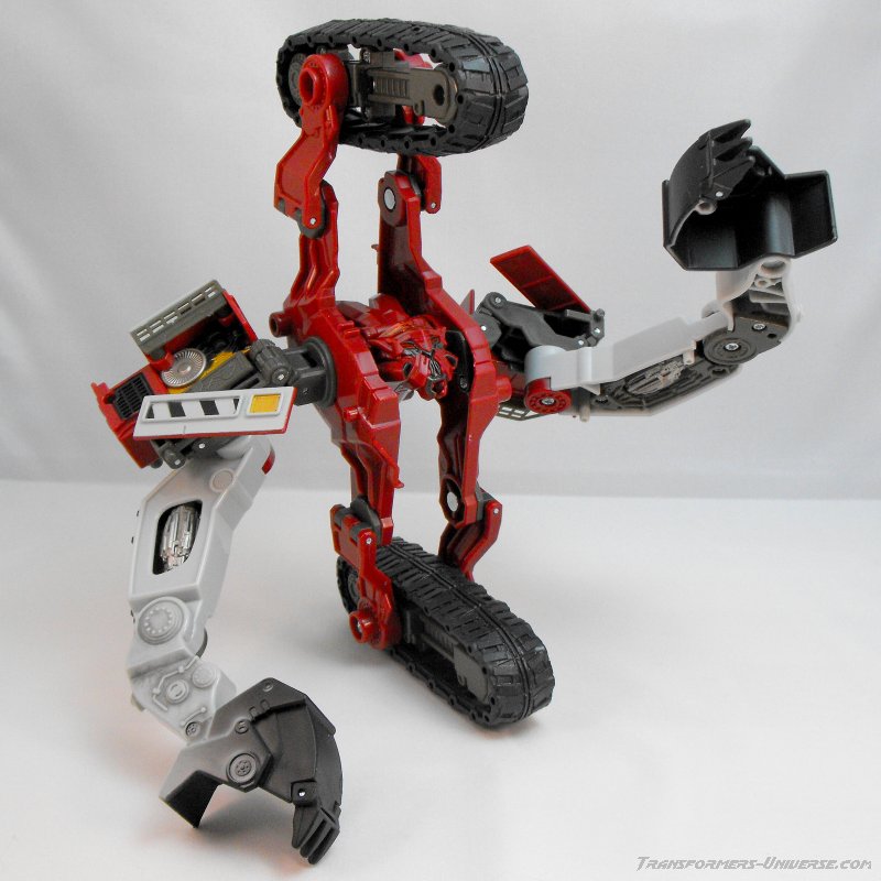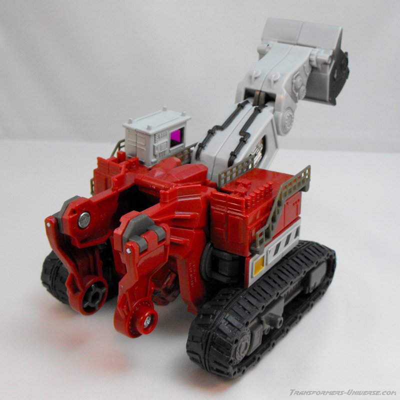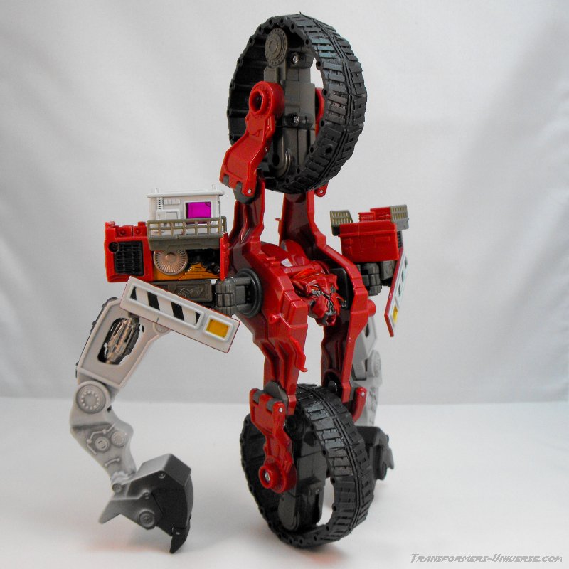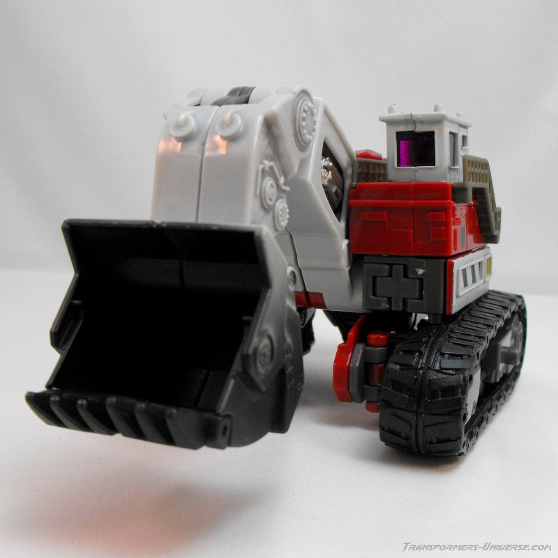 Transformation Details: The treads fold in to form a big wheel, resulting in a giant chain wheel on top and at the bottom, both of which can turn freely. Perfect for driving inside underground tunnels. Die big shovel splits to form the arms and hands. A bit of criticism here: Why the heck can''t the shovels split into three parts to form fingers? There would have been more than enough room here, so some points deducted for that one.