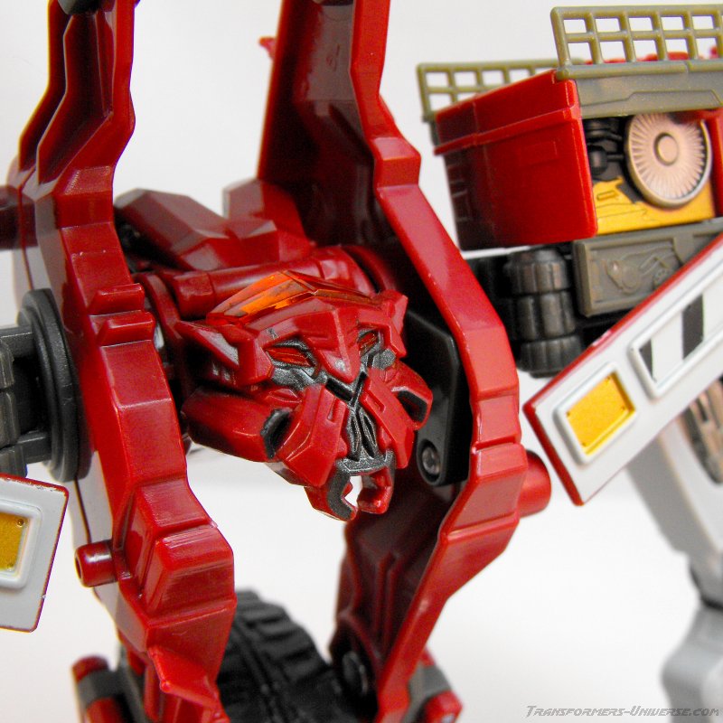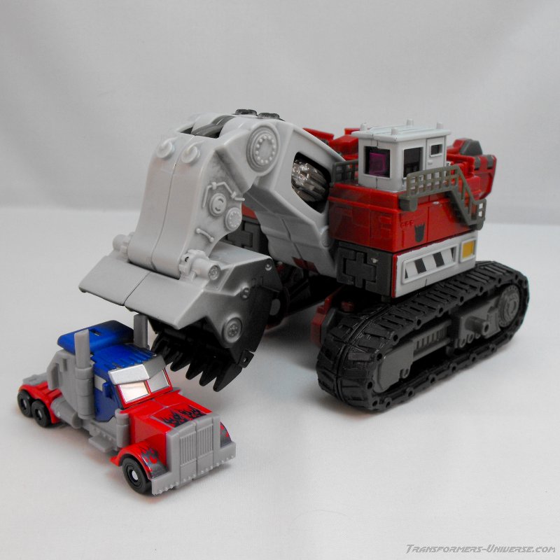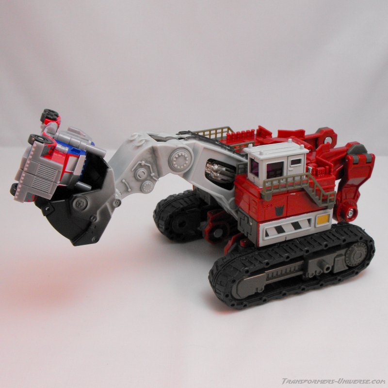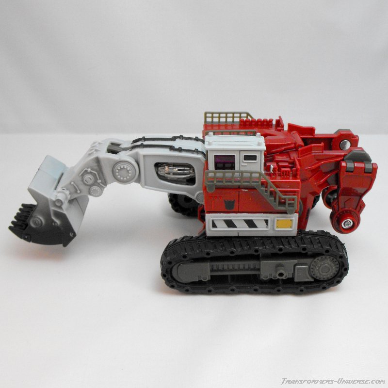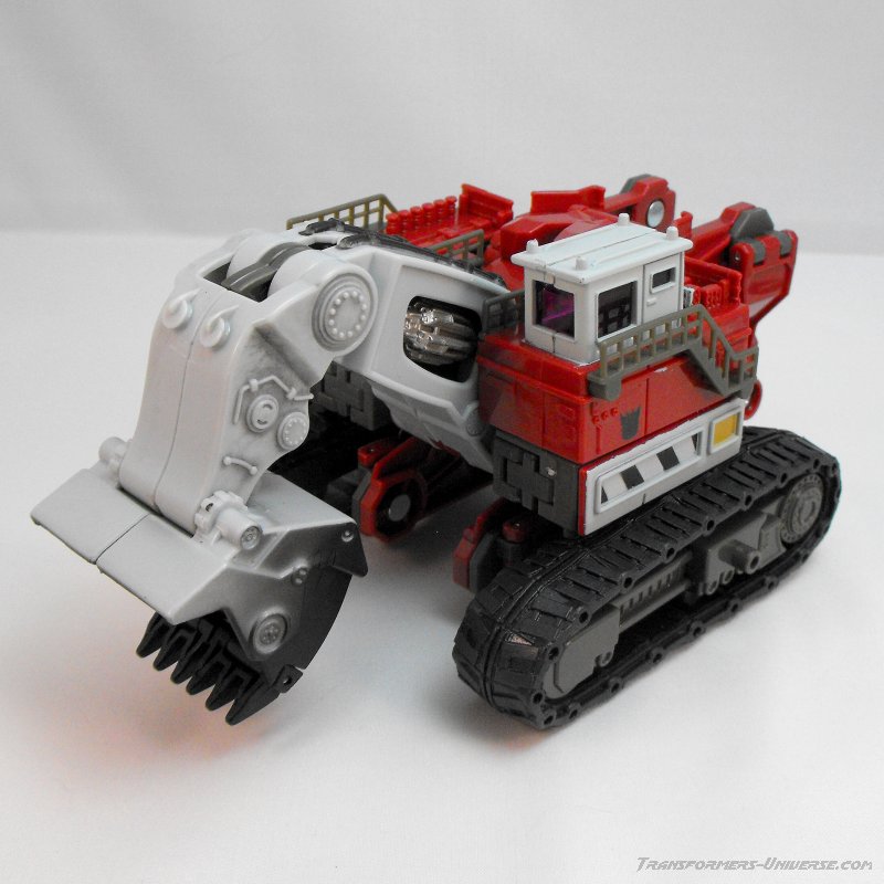 Vehicle Mode: An O&K RH 400 excavator serves as Demolishor's vehicle mode, a gigantic construction vehicle the size of a house. This monster rolls along on two huge treads (which can't actually move because of the transformation requirement) and has the big shovel sticking out front, which is pretty posable to boot. The detailing on the machine is quite good, especially on the control cabin at the top-left corner (which also nicely shows off the scale). So all in all a vehicle mode that, while certainly not spectacular, is very well done. No complaints.