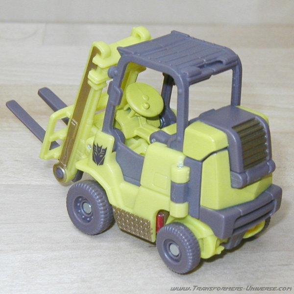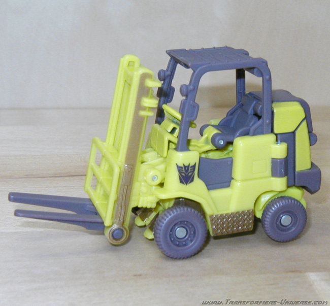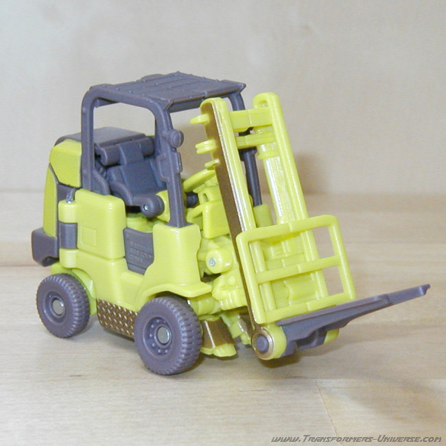 The vehicle itself looks pretty realistic and offers no visible clues as to the robot hidden inside. The fork lift can tilt backwards a bit. The actual forks can't move up or down on the lift, but everything is sculpted pretty nicely, so that isn't much of a problem. The interior of the vehicle is also sculpted, so some details such as a steering wheel are hinted at. The wheels also look pretty nice and for some reason I like the sculpted metal plates on the sides between the wheels. Looks great.