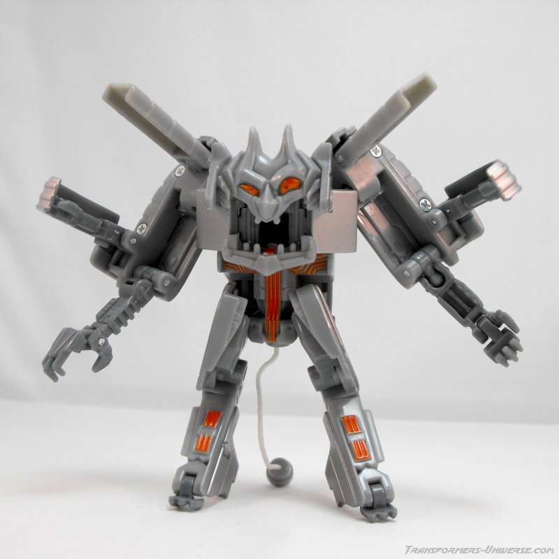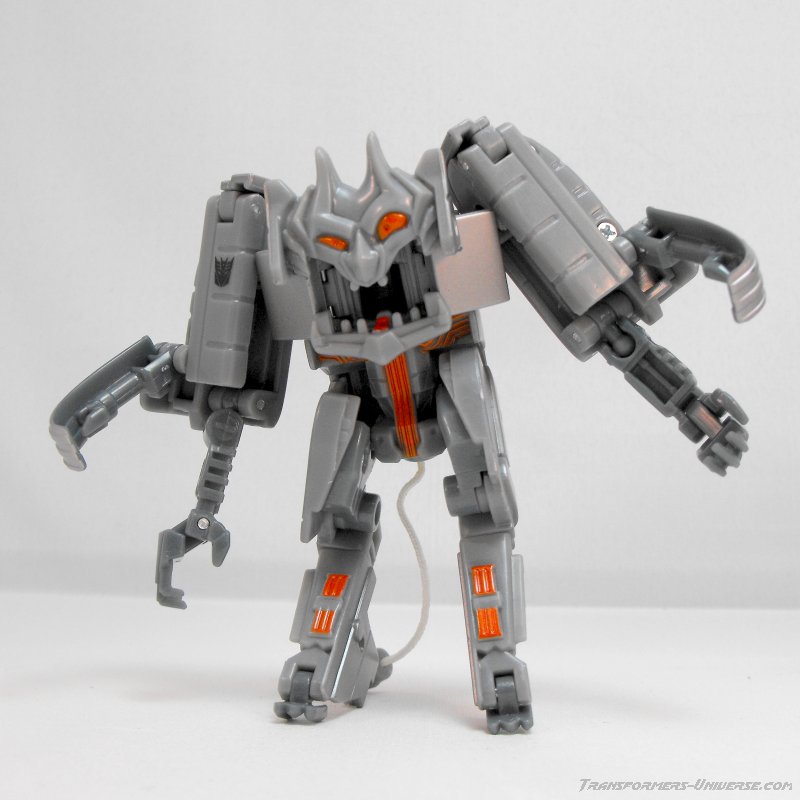 Robot Mode: The first thing Ejector reminded me off was a Gremlin. His torso consists mostly of a big demon-looking face with a big maw and differently-sized eyes. He stands on tiny little legs (and yes, it’s the ROTF-standard chicken legs) and can unfold four arms, each ending in tiny little claws. He even has a tail (the power cord from his toaster mode) hanging off his butt.
