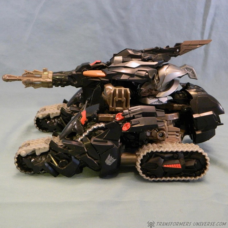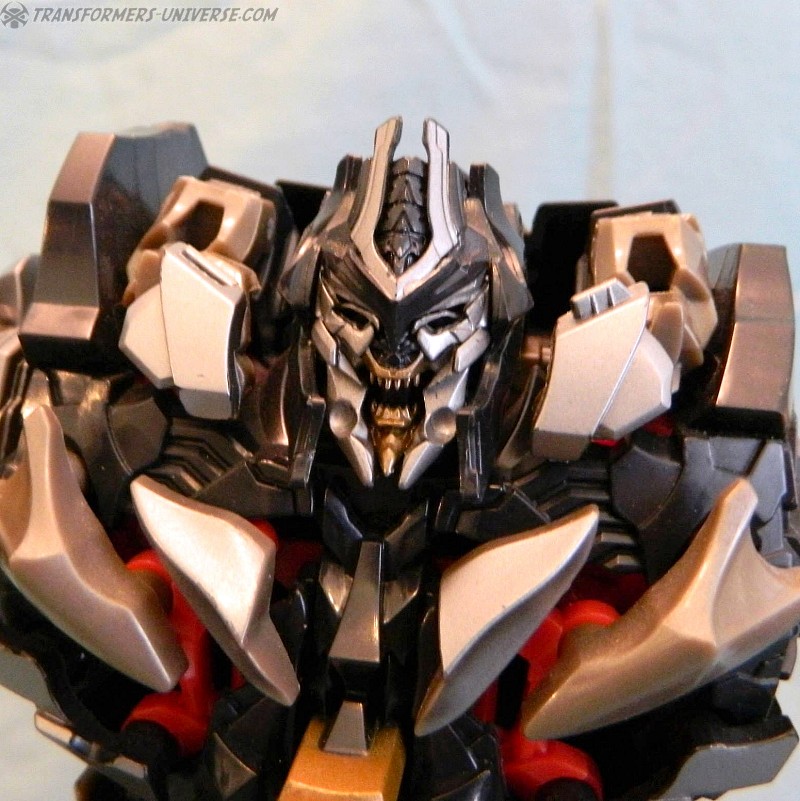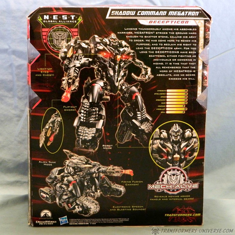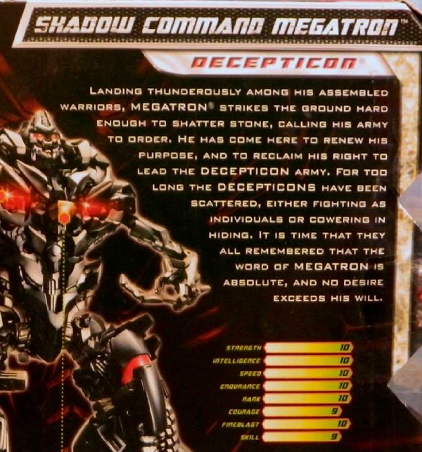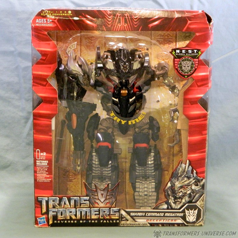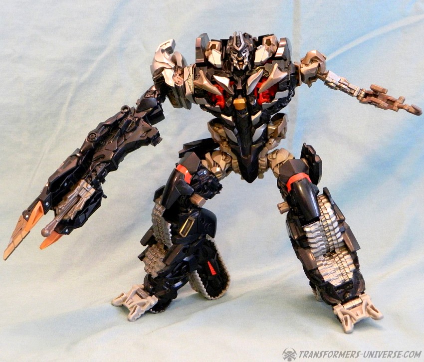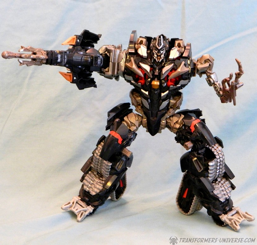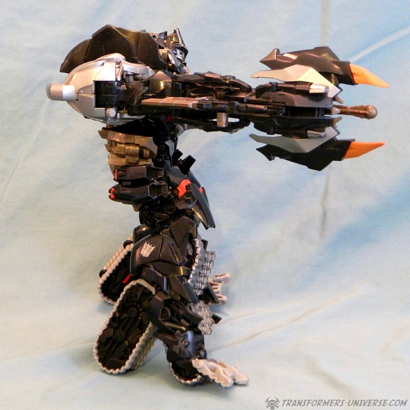 Remarks: Shadow Command Megatron is a repaint of the regular Leader-Class Megatron from Revenge of the Fallen, which I have previously reviewed. Not much has changed except the coloring, now being largely black. According to TFwiki, the voice chip has been changed as well. Instead of saying "I am Megatron!", it says "There is no command but mine!". The blast sound effect has also been changed to a laser sound, and a G1-esque sound effect plays when rotating Megatron's legs during transformation. This is just the US version, of course. Since lines and sound effects tend to be changed for international releases, there might well be other versions out there.
