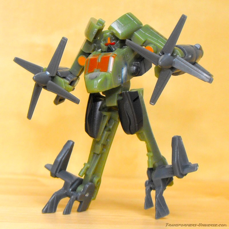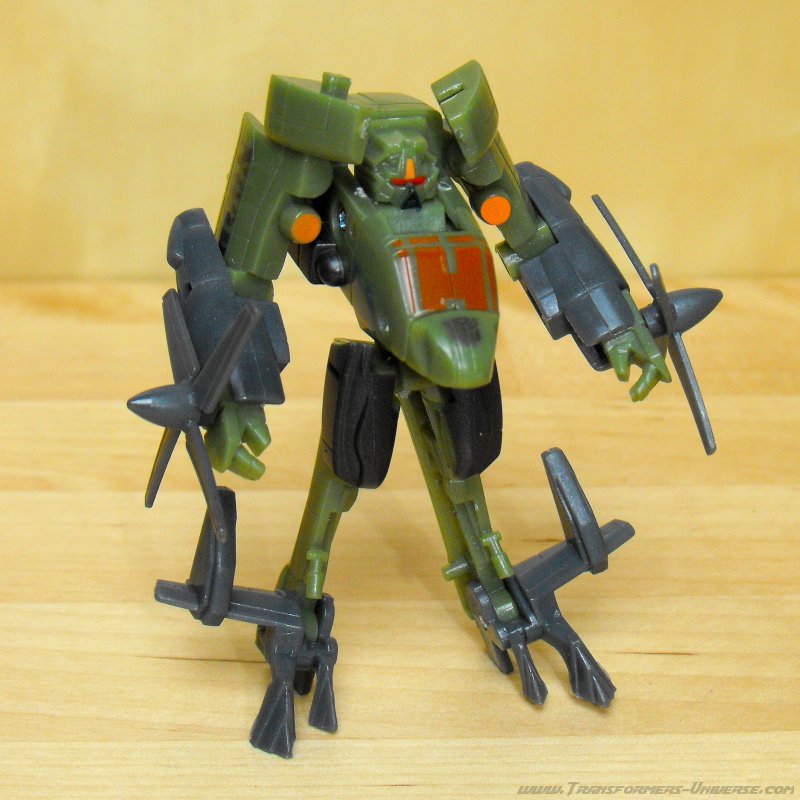 Articulation is as good as you can reasonably expect from a Legends-class figure, so Springer can at least adopt a walking pose (somewhat) and point his rotors forward for imagined slashing attacks. The detailing on the small figure is quite good. There is little resemblance to G1 Springer, but apparently being a green helicopter bot (not really a helicopter, mind you, but with rotor blades) was enough. So bottom line: a nice robot mode, fully sufficient for this size class.