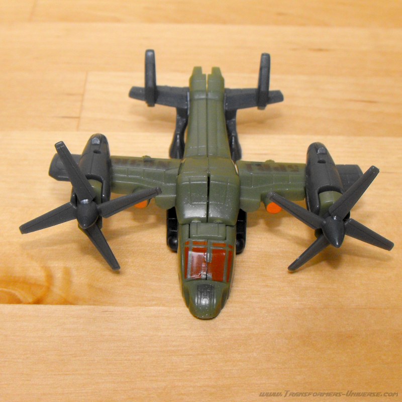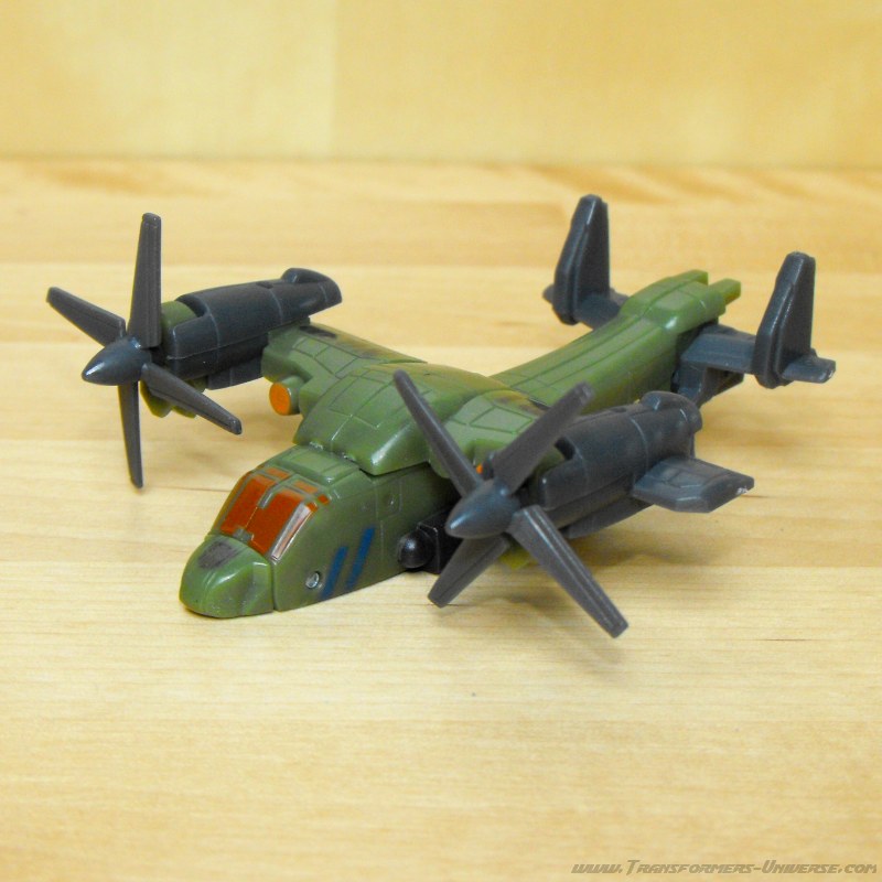 Alternate Mode: Springer transforms into a V-22 Osprey helicopter / plane (the Osprey being a hybrid between the two). He’s got the number code 5PR1N6ER printed across his wingspan (I hope I do not need to spell the “hidden” message, do I?) and overall the little vehicle looks pretty good. A real Osprey can, of course, twist his rotor blades from forward to upward position and while there is no such “articulation” in the wings themselves, you can still flip up the actual rotors to simulate this, though you flip out the robot hands in the process. Overall a nice little vehicle mode, perfectly fine for a Legends-class figure.