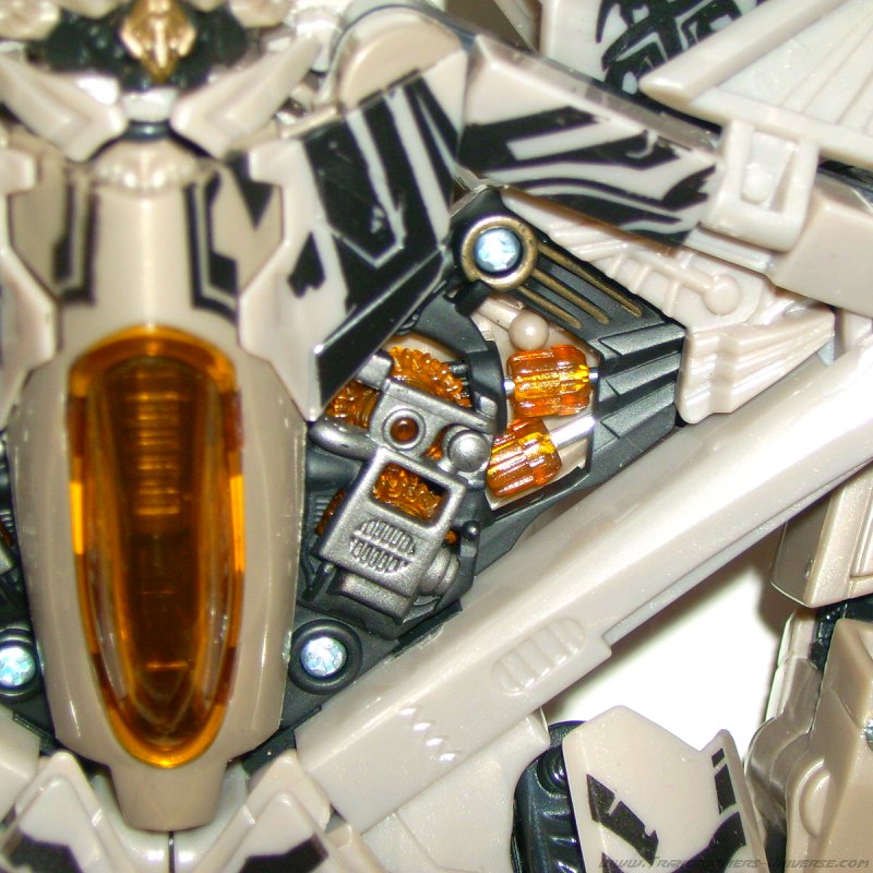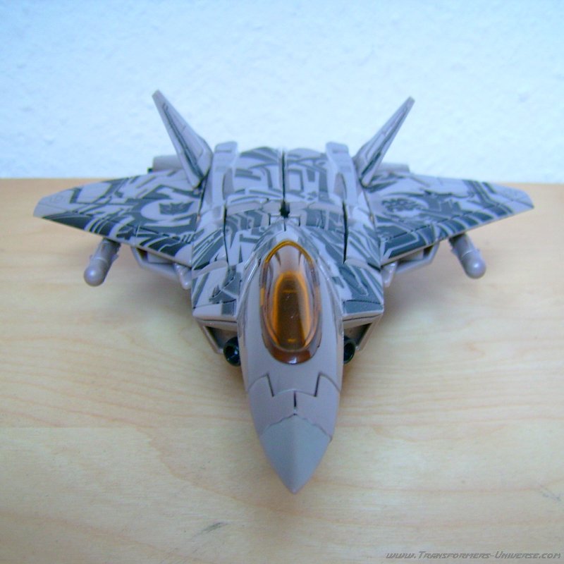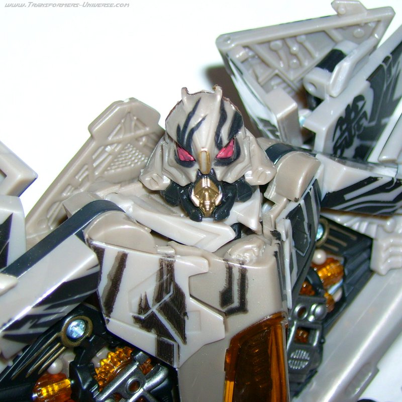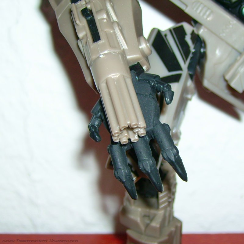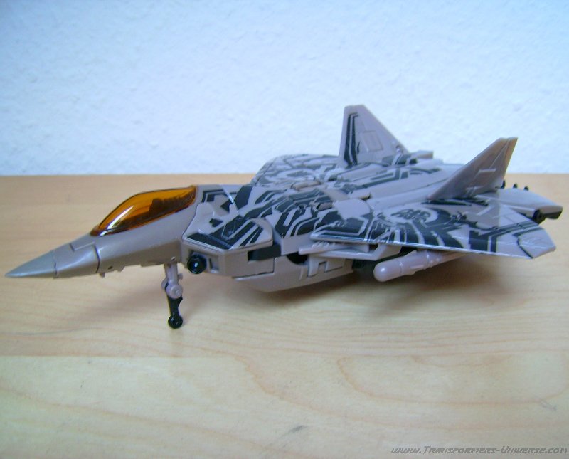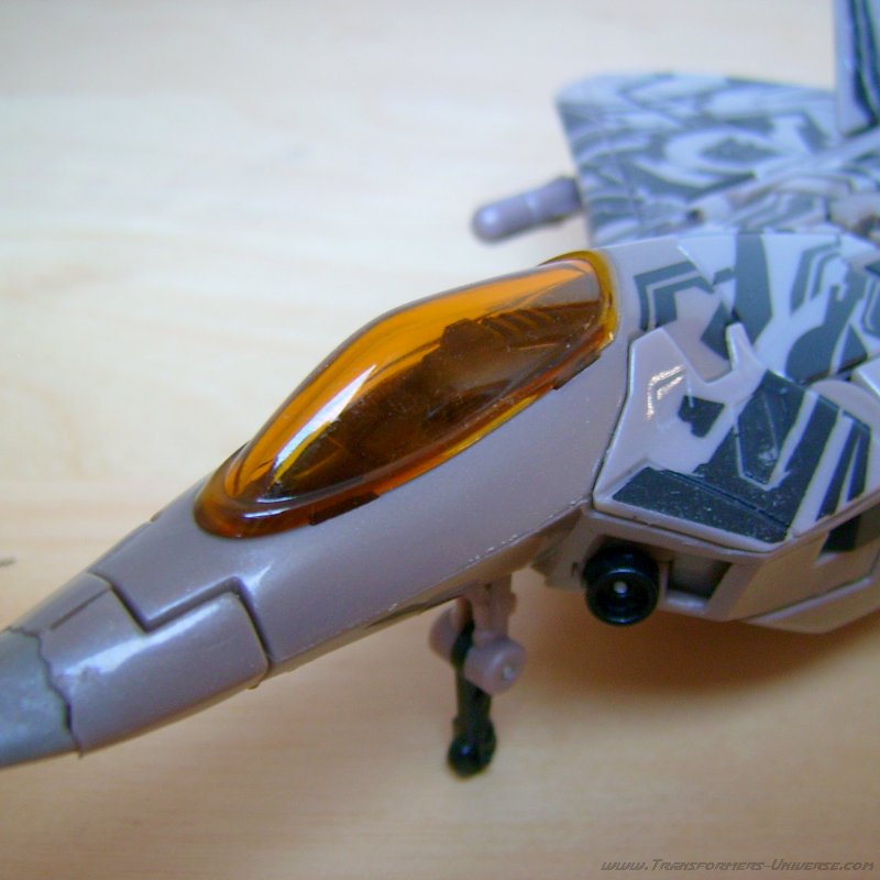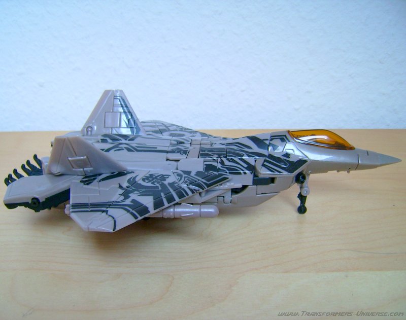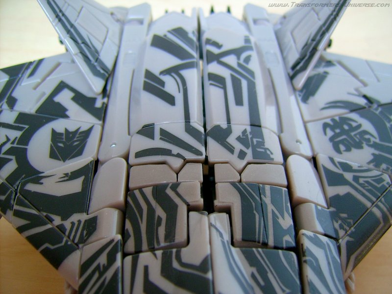 Alternate Mode: In this mode the warpaint looks even better. The right wing features the Decepticon logo, the left a Cybertronian hieroglyph. Some people think that the hieroglyph is the Cybertronian language version of the logo, but personally I think that’s nonsense. After all, the Decepticons used that logo long before they spread out to other worlds. Besides, how do you translate a logo?